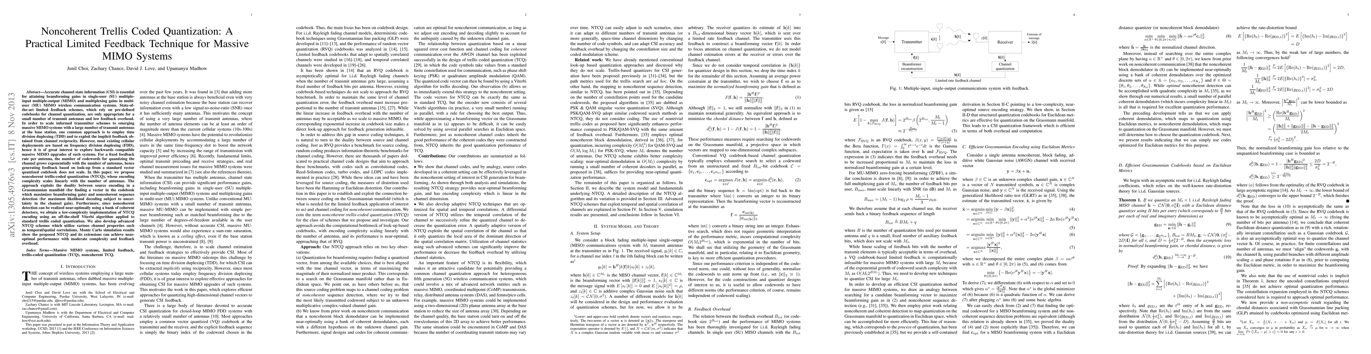 Accurate channel state information (CSI) is essential for attaining beamforming gains in single-user (SU) multiple-input multiple-output (MIMO) and multiplexing gains in multi-user (MU) MIMO wireless communication systems. State-of-the-art limited feedback schemes, which rely on pre-defined codebooks for channel quantization, are only appropriate for a small number of transmit antennas and low feedback overhead. In order to scale informed transmitter schemes to emerging massive MIMO systems with a large number of transmit antennas at the base station, one common approach is to employ time division duplexing (TDD) and to exploit the implicit feedback obtained from channel reciprocity. However, most existing cellular deployments are based on frequency division duplexing (FDD), hence it is of great interest to explore backwards compatible massive MIMO upgrades of such systems. For a fixed feedback rate per antenna, the number of codewords for quantizing the channel grows exponentially with the number of antennas, hence generating feedback based on look-up from a standard vector quantized codebook does not scale. In this paper, we propose noncoherent trellis-coded quantization (NTCQ), whose encoding complexity scales linearly with the number of antennas. The approach exploits the duality between source encoding in a Grassmannian manifold and noncoherent sequence detection. Furthermore, since noncoherent detection can be realized near-optimally using a bank of coherent detectors, we obtain a low-complexity implementation of NTCQ encoding using an off-the-shelf Viterbi algorithm applied to standard trellis coded quantization. We also develop advanced NTCQ schemes which utilize various channel properties such as temporal/spatial correlations. Simulation results show the proposed NTCQ and its extensions can achieve near-optimal performance with moderate complexity and feedback overhead.