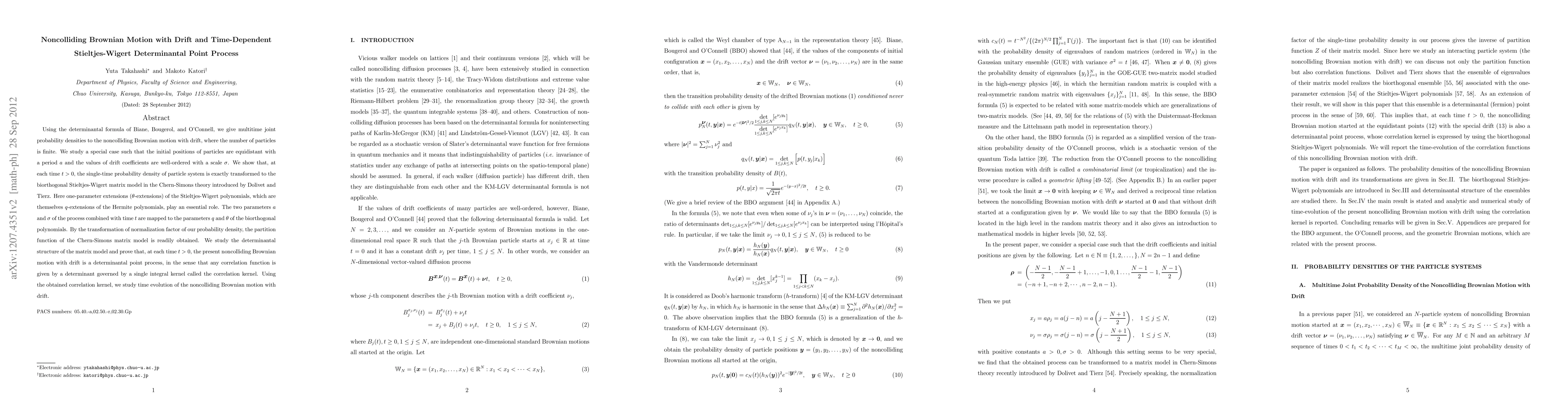 This paper presents a determinantal structure for noncolliding Brownian motion with drift, transforming it into a biorthogonal Stieltjes-Wigert matrix model. The study reveals that the system's single-time probability density corresponds to a determinantal point process, with correlation functions expressed through a correlation kernel derived from the Chern-Simons theory.