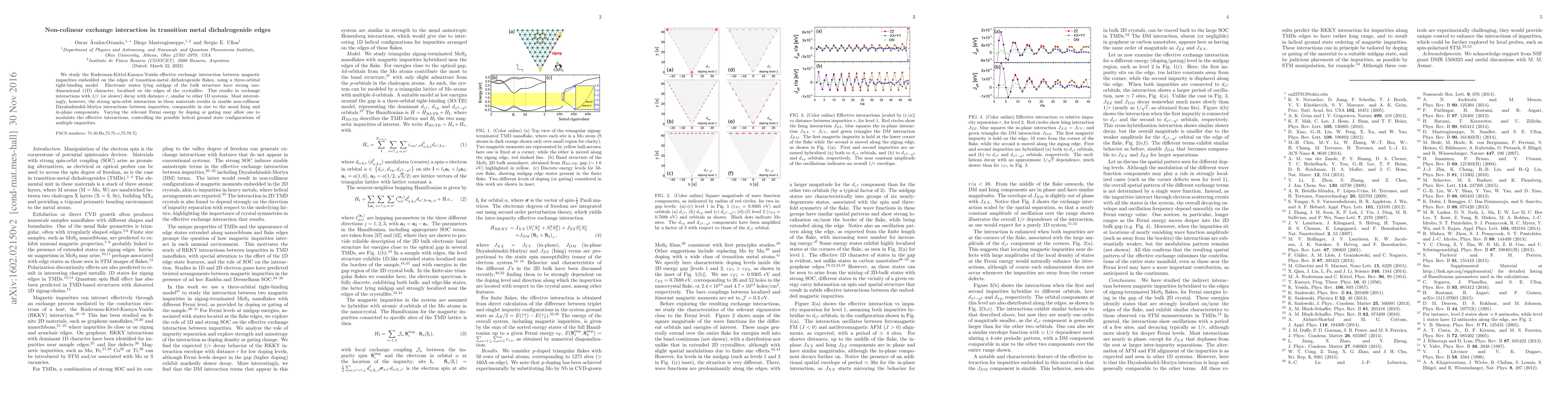 We study the Ruderman-Kittel-Kasuya-Yosida effective exchange interaction between magnetic impurities embedded on the edges of transition-metal dichalcogenide flakes, using a three-orbital tight-binding model. Electronic states lying midgap of the bulk structure have strong one-dimensional (1D) character, localized on the edges of the crystallite. This results in exchange interactions with $1/r$ (or slower) decay with distance $r$, similar to other 1D systems. Most interestingly, however, the strong spin-orbit interaction in these materials results in sizable non-collinear Dzyaloshinskii-Moriya interactions between impurities, comparable in size to the usual Ising and in-plane components. Varying the relevant Fermi energy by doping or gating may allow one to modulate the effective interactions, controlling the possible helical ground state configurations of multiple impurities.