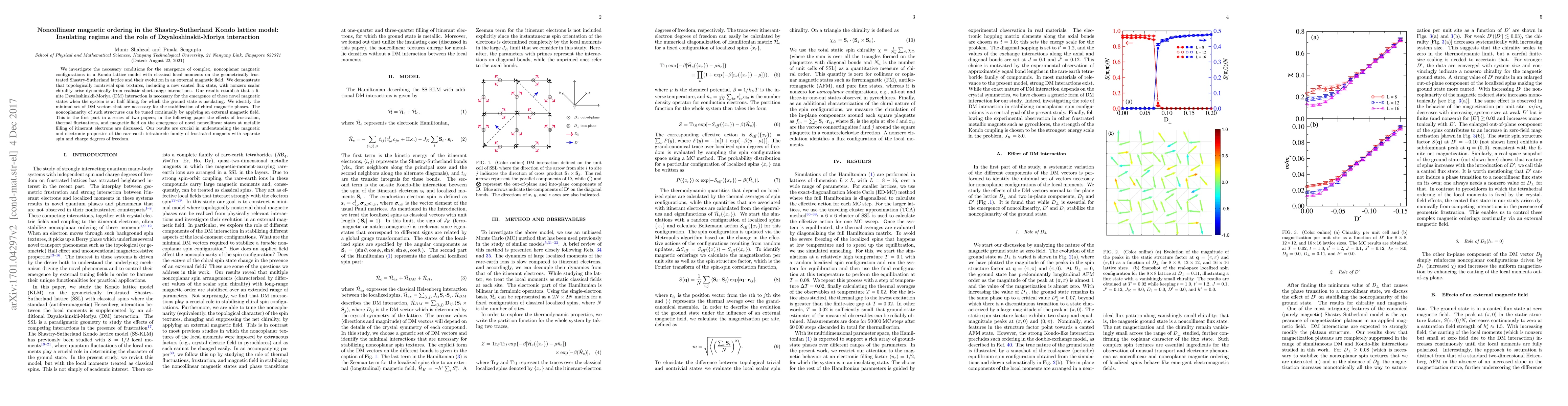 This paper explores the conditions for noncollinear magnetic ordering in a Kondo lattice model on a Shastry-Sutherland lattice, revealing that a finite Dzyaloshinskii-Moriya interaction is essential for the emergence of novel insulating magnetic states, including a new canted flux state. The study identifies the minimal Dzyaloshinskii-Moriya vectors necessary for stabilizing chiral magnetic phases, which can be tuned by external magnetic fields.