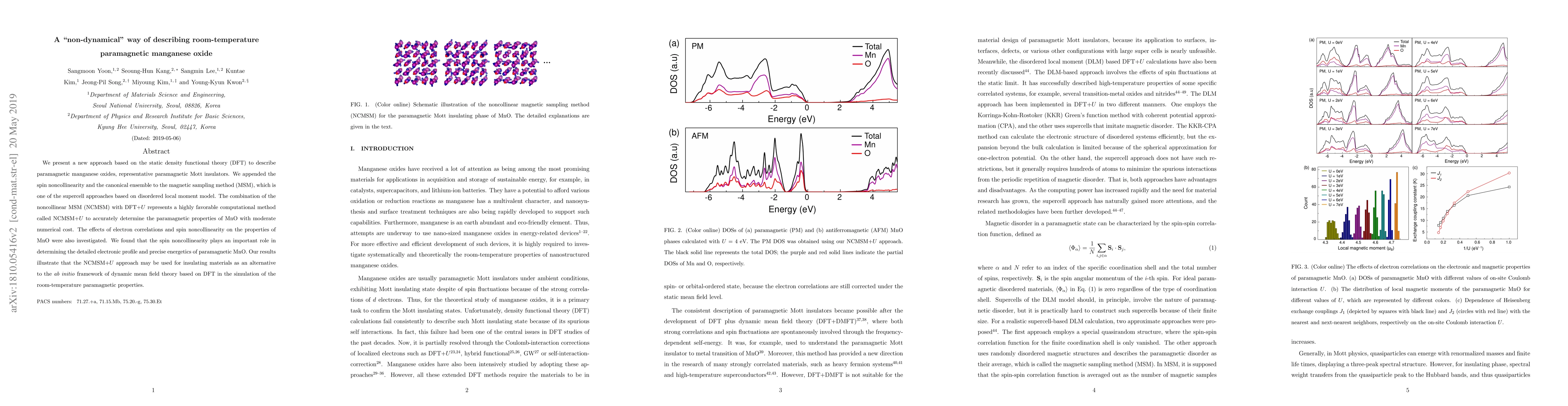 This paper introduces a new computational method combining noncollinear magnetic sampling with DFT$+U$ to accurately determine the paramagnetic properties of MnO, revealing the significant role of spin noncollinearity in its electronic structure and energetics. The proposed NCMSM$+U$ approach offers an alternative to $\textit{ab initio}$ methods for simulating high-temperature properties of Mott insulators.