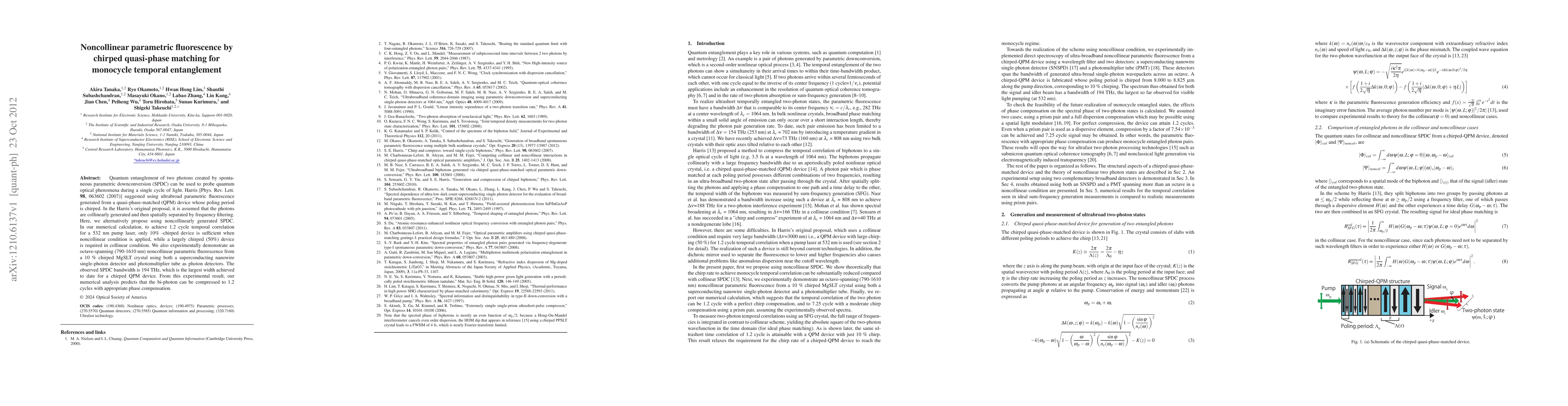 This paper proposes a method for generating noncollinearly entangled photons via chirped quasi-phase matching in a MgSLT crystal, achieving a temporal correlation of 1.2 cycles with a 10% chirped device. Experimental results demonstrate an octave-spanning fluorescence bandwidth of 194 THz, the largest to date, and predict potential compression of bi-photons to 1.2 cycles.