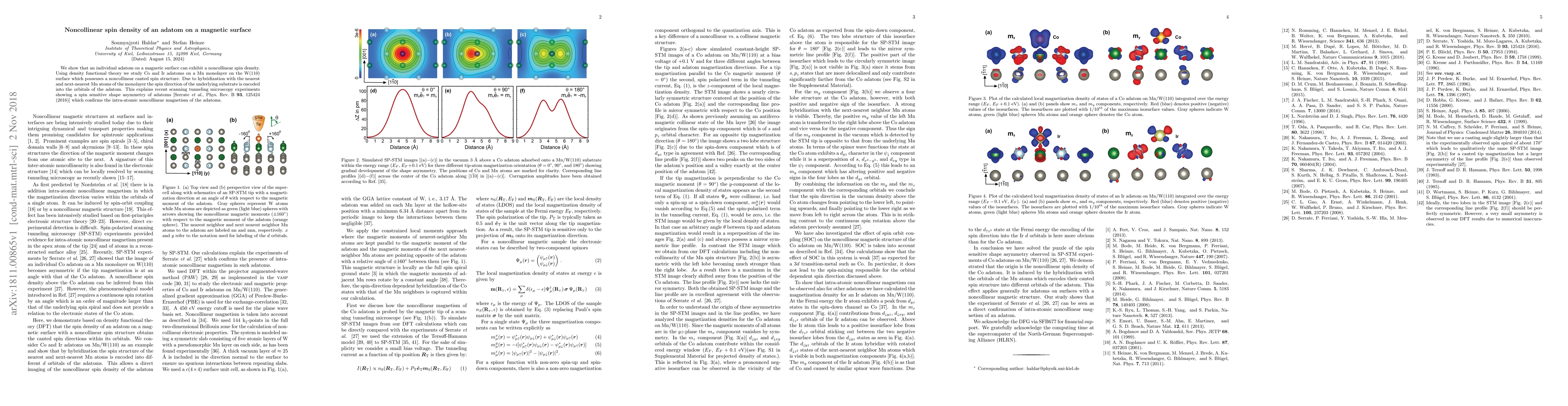 This study reveals that adatoms on a magnetic surface can display noncollinear spin density, demonstrated through the analysis of Co and Ir adatoms on a Mn monolayer on W(110) using density functional theory. The spin direction of the substrate influences the adatom's orbitals, explaining the observed spin-sensitive shape asymmetry in recent experiments.
