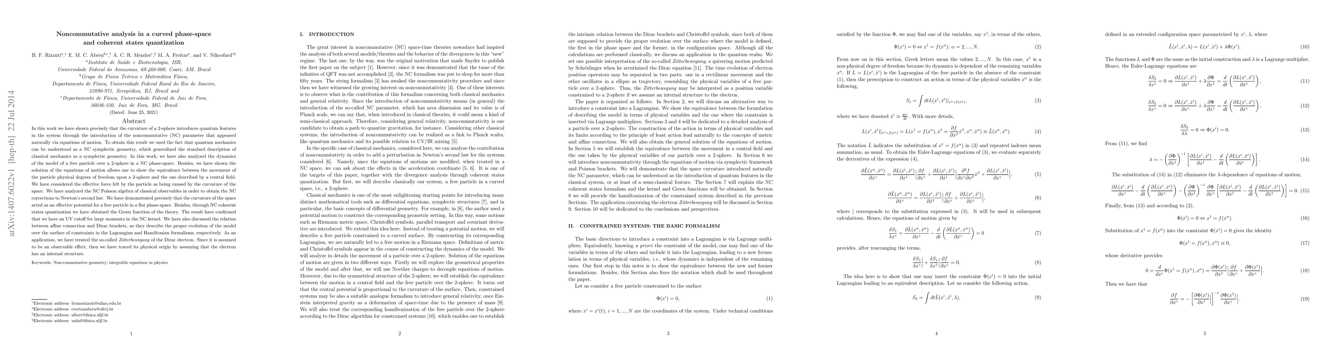 In this work we have shown precisely that the curvature of a 2-sphere introduces quantum features in the system through the introduction of the noncommutative (NC) parameter that appeared naturally via equations of motion. To obtain this result we used the fact that quantum mechanics can be understood as a NC symplectic geometry, which generalized the standard description of classical mechanics as a symplectic geometry. In this work, we have also analyzed the dynamics of the model of a free particle over a 2-sphere in a NC phase-space. Besides, we have shown the solution of the equations of motion allows one to show the equivalence between the movement of the particle physical degrees of freedom upon a 2-sphere and the one described by a central field. We have considered the effective force felt by the particle as being caused by the curvature of the space. We have analyzed the NC Poisson algebra of classical observables in order to obtain the NC corrections to Newton's second law. We have demonstrated precisely that the curvature of the space acted as an effective potential for a free particle in a flat phase-space. Besides, through NC coherent states quantization we have obtained the Green function of the theory. The result have confirmed that we have an UV cutoff for large momenta in the NC kernel. We have also discussed the relation between affine connection and Dirac brackets, as they describe the proper evolution of the model over the surface of constraints in the Lagrangian and Hamiltonian formalisms, respectively. As an application, we have treated the so-called \textit{Zitterbewegung} of the Dirac electron. Since it is assumed to be an observable effect, then we have traced its physical origin by assuming that the electron has an internal structure.