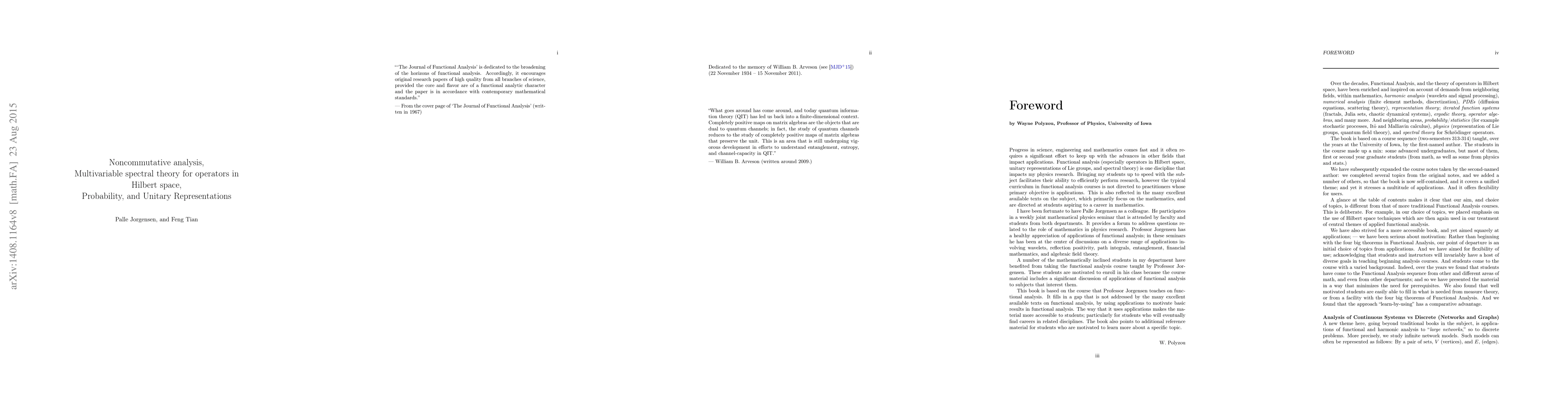 Over the decades, Functional Analysis has been enriched and inspired on account of demands from neighboring fields, within mathematics, harmonic analysis (wavelets and signal processing), numerical analysis (finite element methods, discretization), PDEs (diffusion equations, scattering theory), representation theory; iterated function systems (fractals, Julia sets, chaotic dynamical systems), ergodic theory, operator algebras, and many more. And neighboring areas, probability/statistics (for example stochastic processes, Ito and Malliavin calculus), physics (representation of Lie groups, quantum field theory), and spectral theory for Schr\"odinger operators. We have strived for a more accessible book, and yet aimed squarely at applications; -- we have been serious about motivation: Rather than beginning with the four big theorems in Functional Analysis, our point of departure is an initial choice of topics from applications. And we have aimed for flexibility of use; acknowledging that students and instructors will invariably have a host of diverse goals in teaching beginning analysis courses. And students come to the course with a varied background. Indeed, over the years we found that students have come to the Functional Analysis sequence from other and different areas of math, and even from other departments; and so we have presented the material in a way that minimizes the need for prerequisites. We also found that well motivated students are easily able to fill in what is needed from measure theory, or from a facility with the four big theorems of Functional Analysis. And we found that the approach "learn-by-using" has a comparative advantage.