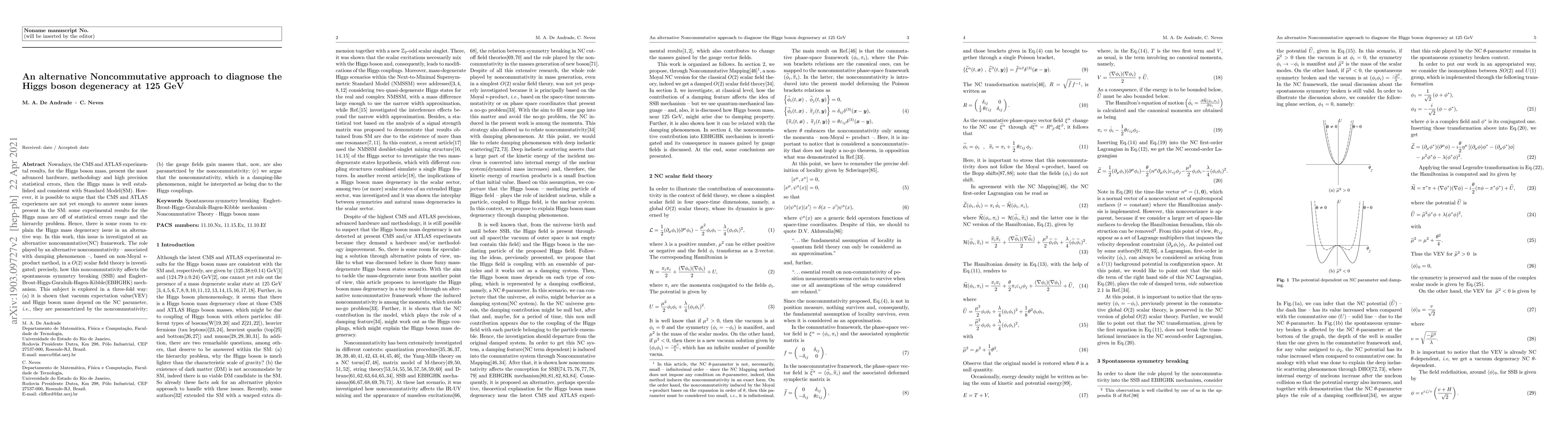 We propose a noncommutative (NC) version for a global O(2) scalar field theory, whose damping feature is introduced into the scalar field theory through the NC parameter. In this context, we investigate how noncommutative drives spontaneous symmetry breaking (SSB) and Higgs-Kibble mechanisms and how the damping feature workout. Indeed, we show that the noncommutativity plays an important role in such mechanisms, i.e., the Higgs mass and VEV dependent on NC parameter. After that, it is explored the consequences of noncommutativity dependence of Higgs mass and VEV: for the first, it is shown that there are a mass-degenerate Higgs bosons near 126.5 GeV, parametrized by the noncommutativity; for the second, the gauge fields gain masses that present a noncommutativity contribution.
