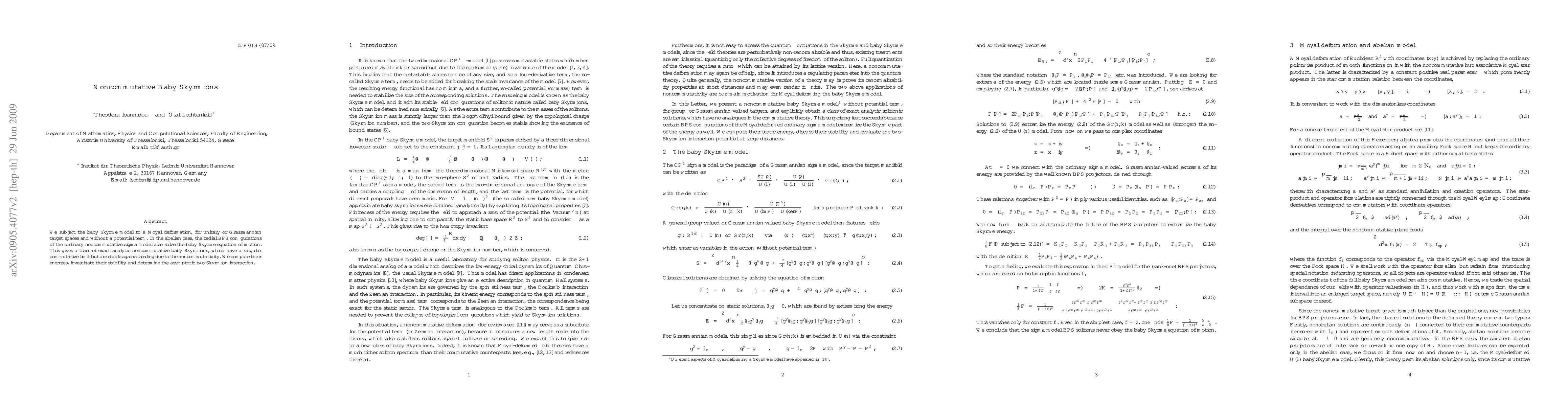 The paper investigates noncommutative baby Skyrmions formed by Moyal deformation of the baby Skyrme model, revealing exact analytic solutions that remain stable due to noncommutativity and showing their energies, stability, and two-Skyrmion interaction.