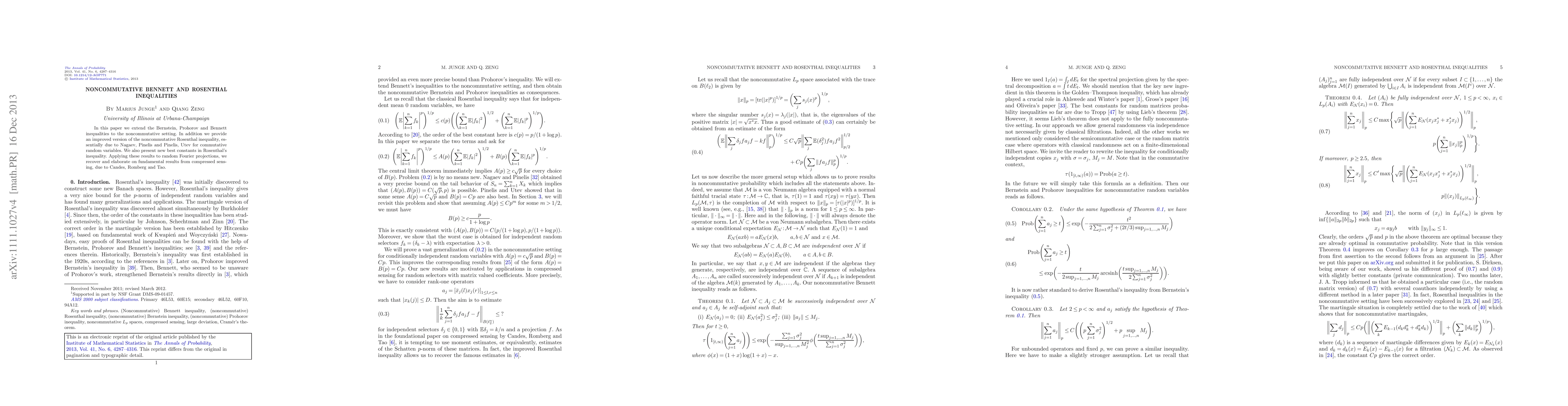 This paper extends classical inequalities like Bernstein, Prohorov, and Bennett to the noncommutative setting and improves the noncommutative Rosenthal inequality with new best constants. It also applies these results to random Fourier projections, enhancing fundamental compressed sensing results from Candes, Romberg, and Tao.
