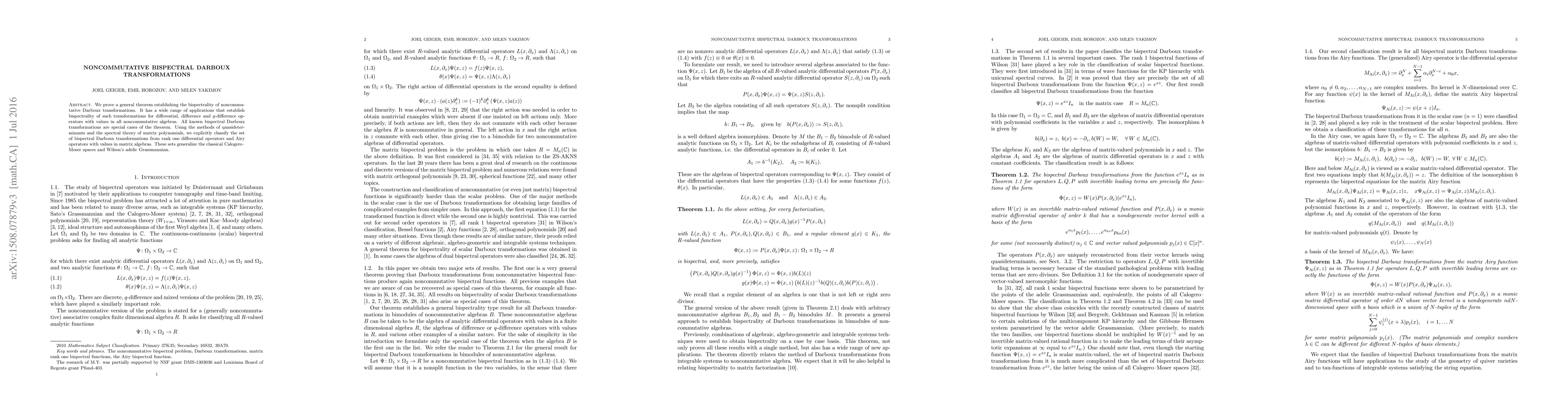 The paper establishes a theorem proving the bispectrality of noncommutative Darboux transformations and applies it to differential, difference, and q-difference operators across all noncommutative algebras. It also classifies bispectral Darboux transformations from rank one differential operators and Airy operators, generalizing classical Calogero-Moser spaces and Wilson's adelic Grassmannian.