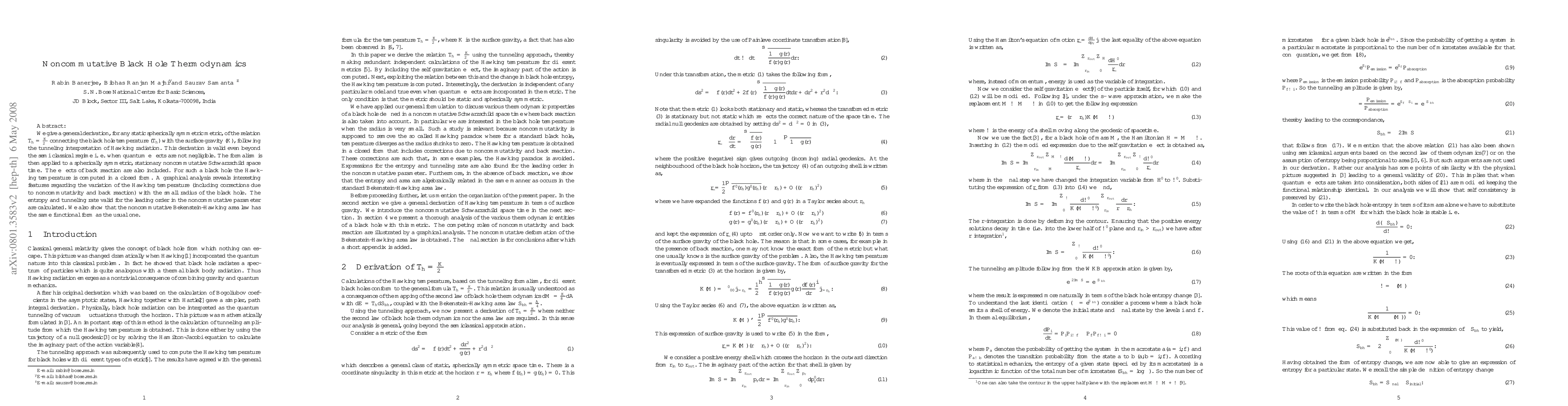 We give a general derivation, for any static spherically symmetric metric, of the relation $T_h=\frac{\cal K}{2\pi}$ connecting the black hole temperature ($T_h$) with the surface gravity ($\cal K$), following the tunneling interpretation of Hawking radiation. This derivation is valid even beyond the semi classical regime i. e. when quantum effects are not negligible. The formalism is then applied to a spherically symmetric, stationary noncommutative Schwarzschild space time. The effects of back reaction are also included. For such a black hole the Hawking temperature is computed in a closed form. A graphical analysis reveals interesting features regarding the variation of the Hawking temperature (including corrections due to noncommutativity and back reaction) with the small radius of the black hole. The entropy and tunneling rate valid for the leading order in the noncommutative parameter are calculated. We also show that the noncommutative Bekenstein-Hawking area law has the same functional form as the usual one.