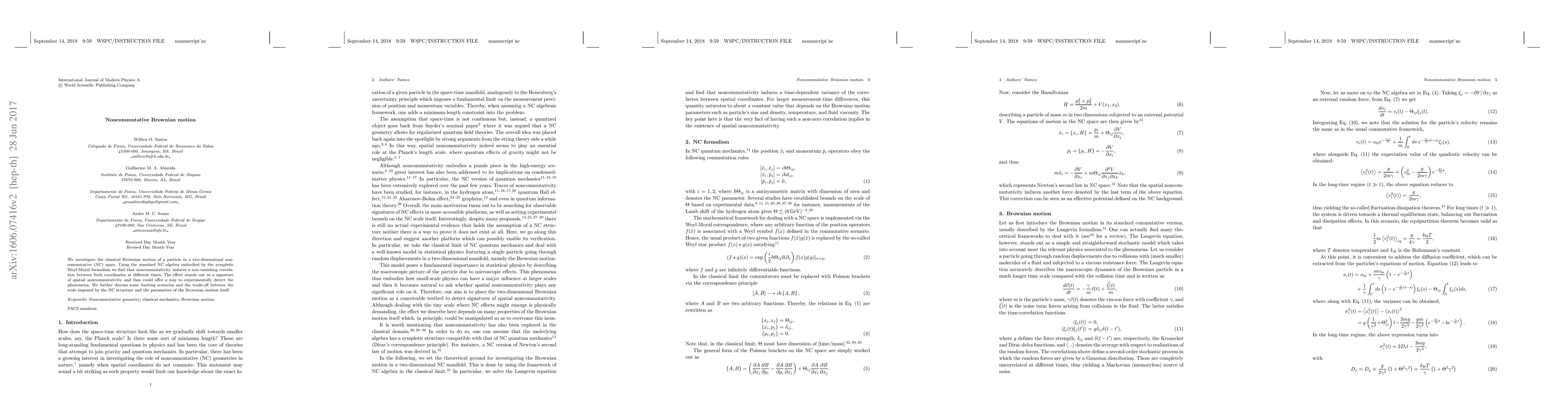 We investigate the classical Brownian motion of a particle in a two-dimensional noncommutative (NC) space. Using the standard NC algebra embodied by the sympletic Weyl-Moyal formalism we find that noncommutativity induces a non-vanishing correlation between both coordinates at different times. The effect stands out as a signature of spatial noncommutativity and thus could offer a way to experimentally detect the phenomena. We further discuss some limiting scenarios and the trade-off between the scale imposed by the NC structure and the parameters of the Brownian motion itself.