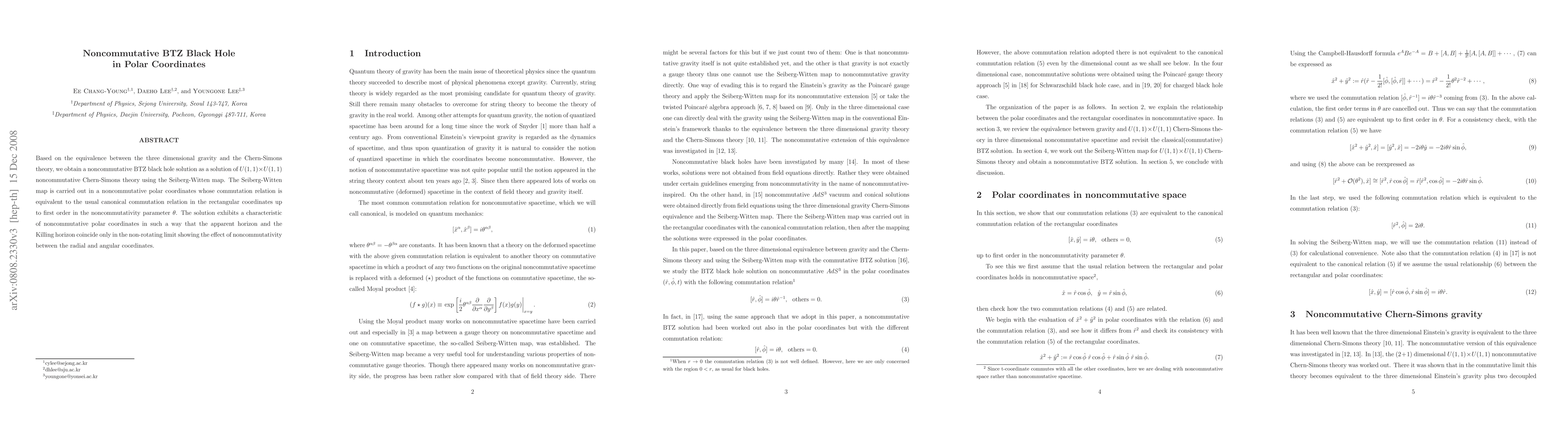 The paper presents a detailed derivation of a noncommutative BTZ black hole solution using the Seiberg-Witten map in a noncommutative polar coordinate system, extending previous work on commutative BTZ black holes in Chern-Simons theory.