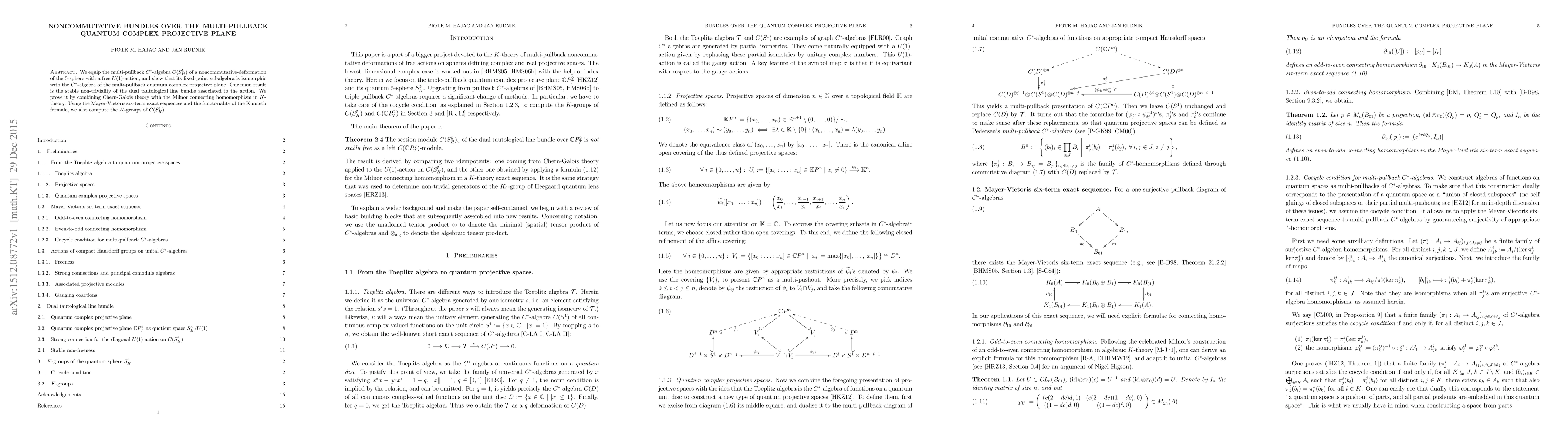 We equip the multi-pullback $C^*$-algebra $C(S^5_H)$ of a noncommutative-deformation of the 5-sphere with a free $U(1)$-action, and show that its fixed-point subalgebra is isomorphic with the $C^*$-algebra of the multi-pullback quantum complex projective plane. Our main result is the stable non-triviality of the dual tautological line bundle associated to the action. We prove it by combining Chern-Galois theory with the Milnor connecting homomorphism in $K$-theory. Using the Mayer-Vietoris six-term exact sequences and the functoriality of the K\"unneth formula, we also compute the $K$-groups of $C(S^5_H)$.