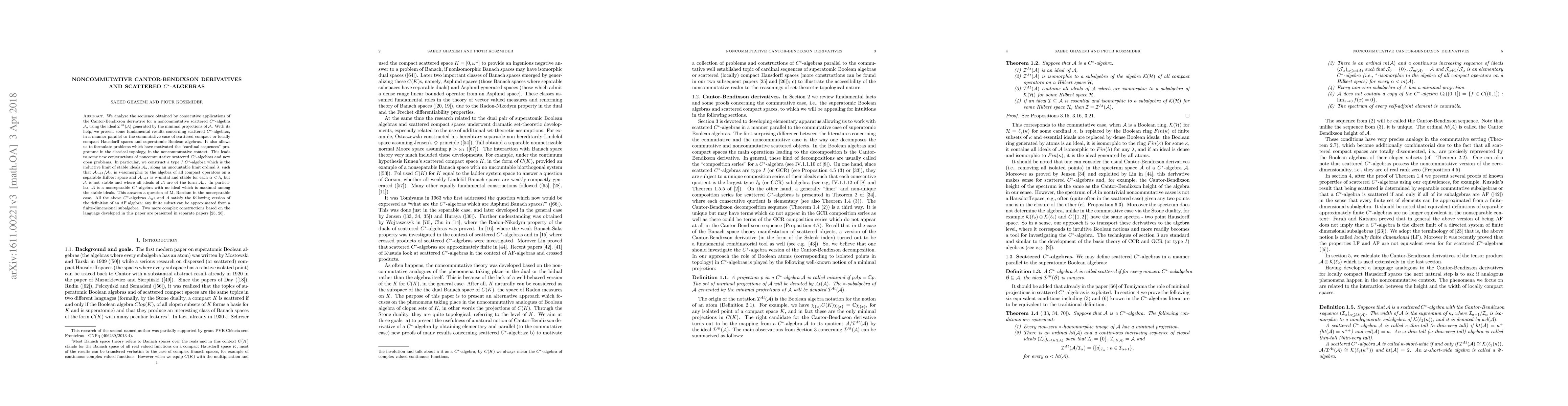 We analyze the sequence obtained by consecutive applications of the Cantor-Bendixson derivative for a noncommutative scattered $C^*$-algebra $\mathcal A$, using the ideal $\mathcal I^{At}(\mathcal A)$ generated by the minimal projections of $\mathcal A$. With its help, we present some fundamental results concerning scattered $C^*$-algebras, in a manner parallel to the commutative case of scattered compact or locally compact Hausdorff spaces and superatomic Boolean algebras. It also allows us to formulate problems which have motivated the "cardinal sequences" programme in the classical topology, in the noncommutative context. This leads to some new constructions of noncommutative scattered $C^*$-algebras and new open problems. In particular, we construct a type $I$ $C^*$-algebra which is the inductive limit of stable ideals $\mathcal A_\alpha$, along an uncountable limit ordinal $\lambda$, such that $\mathcal A_{\alpha+1}/\mathcal A_\alpha$ is $*$-isomorphic to the algebra of all compact operators on a separable Hilbert space and $\mathcal A_{\alpha+1}$ is $\sigma$-unital and stable for each $\alpha<\lambda$, but $\mathcal A$ is not stable and where all ideals of $\mathcal A$ are of the form $\mathcal A_\alpha$. In particular, $\mathcal A$ is a nonseparable $C^*$-algebra with no ideal which is maximal among the stable ideals. This answers a question of M. R\ordam in the nonseparable case. All the above $C^*$-algebras $A_\alpha$s and $A$ satisfy the following version of the definition of an AF algebra: any finite subset can be approximated from a finite-dimensional subalgebra. Two more complex constructions based on the language developed in this paper are presented in separate papers.