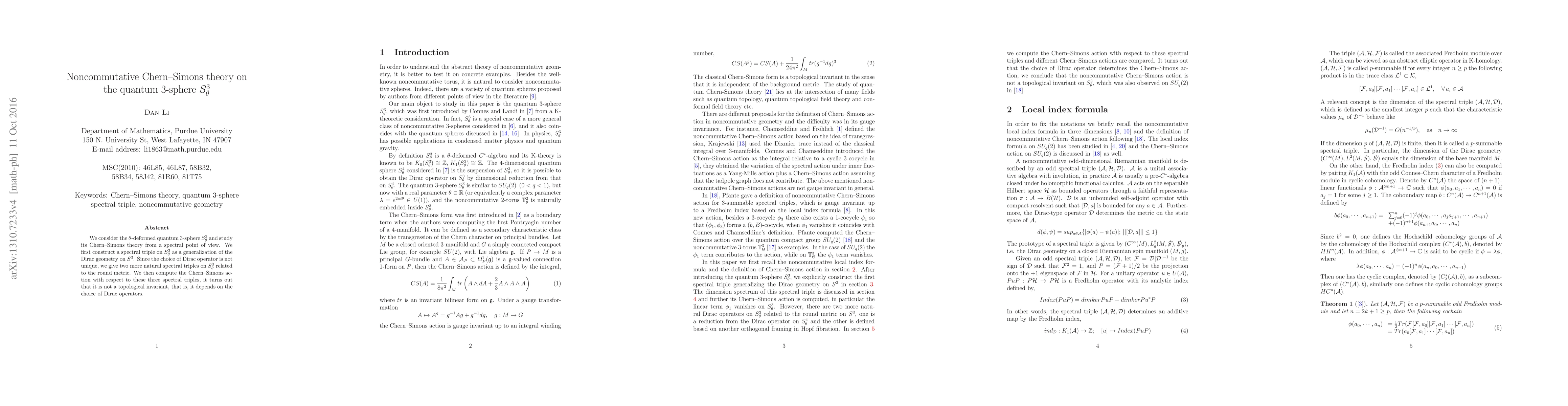 We consider the $\theta$-deformed quantum three sphere $S^3_\theta$ and study its Chern--Simons theory from a spectral point of view. We first construct a spectral triple on $S^3_\theta$ as a generalization of the Dirac geometry on $S^3 $. Since the choice of Dirac operator is not unique, we give two more natural spectral triples on $S^3_\theta$ related to the standard round metric. We then compute the Chern--Simons action with respect to the three spectral triples, it turns out that it is not a topological invariant, that is, it depends on the choice of Dirac operators.