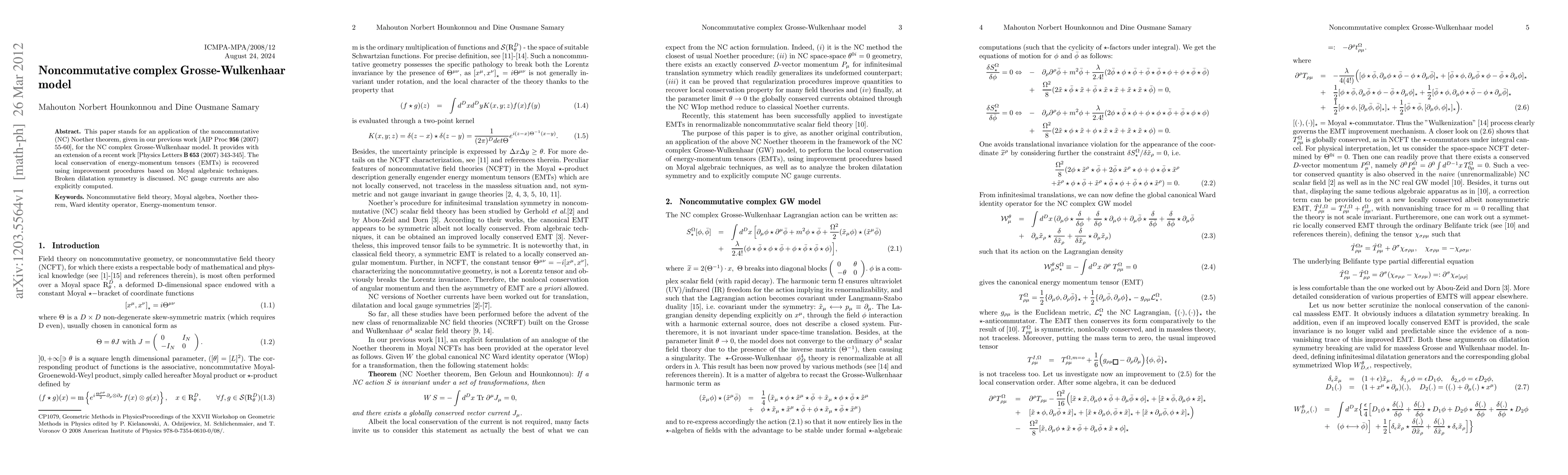 This paper applies the noncommutative Noether theorem to the NC complex Grosse-Wulkenhaar model, extending recent work and utilizing Moyal algebraic techniques to recover local conservation of energy-momentum tensors, while discussing broken dilatation symmetry and computing NC gauge currents.