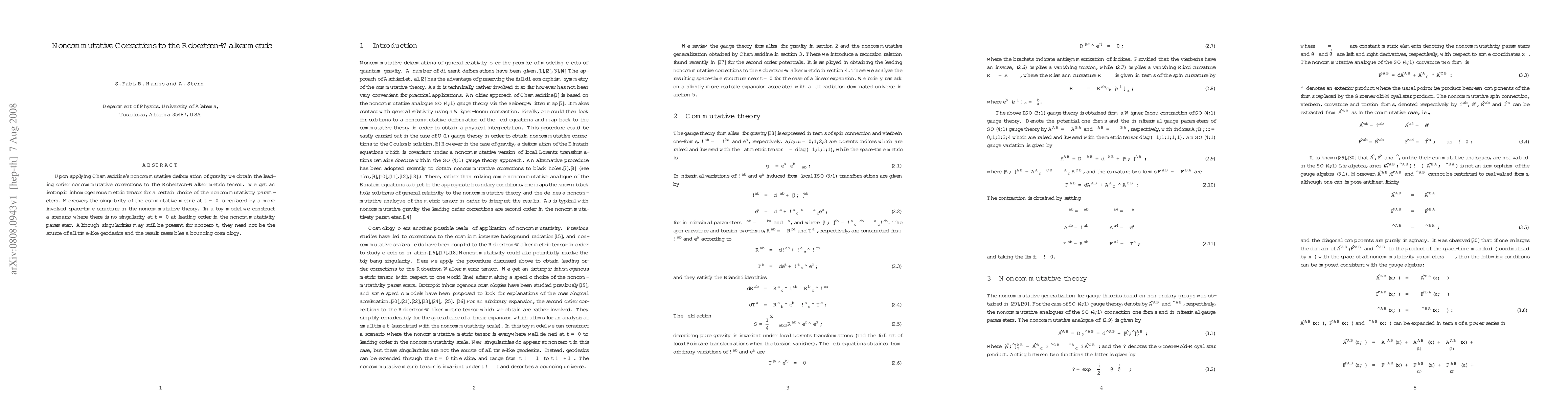 This paper applies Chamseddine's noncommutative deformation to the Robertson-Walker metric, revealing leading order corrections that yield an isotropic inhomogeneous metric tensor. The noncommutative approach replaces the singularity at $t=0$ with a more complex spacetime structure, potentially leading to a bouncing cosmology scenario without a singularity at leading order.