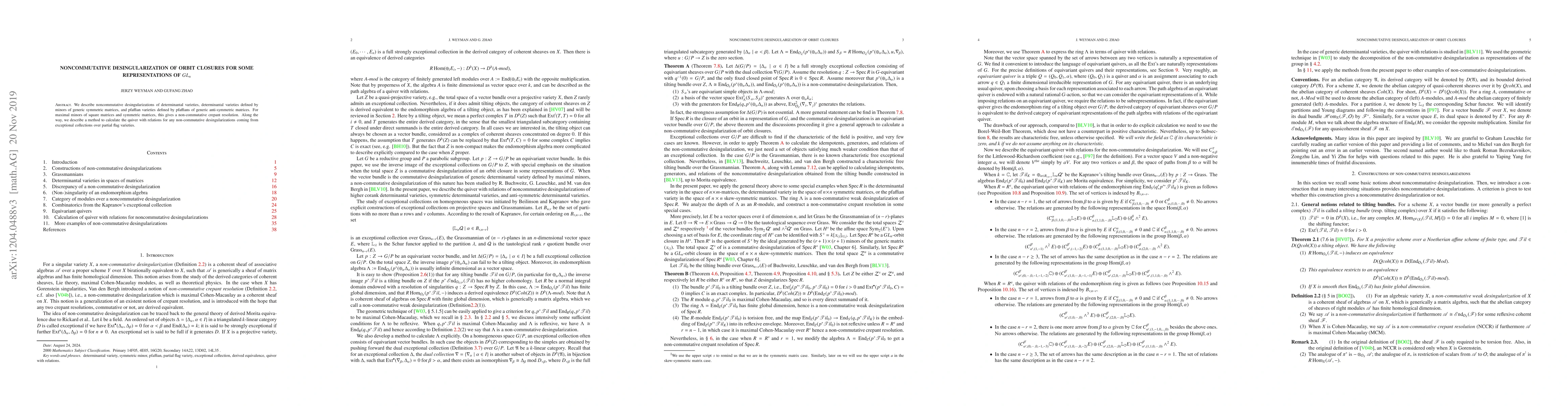 This paper presents noncommutative desingularizations for determinantal and pfaffian varieties, achieving a non-commutative crepant resolution for maximal minors. It also outlines a method to determine the quiver with relations for such desingularizations derived from exceptional collections over partial flag varieties.