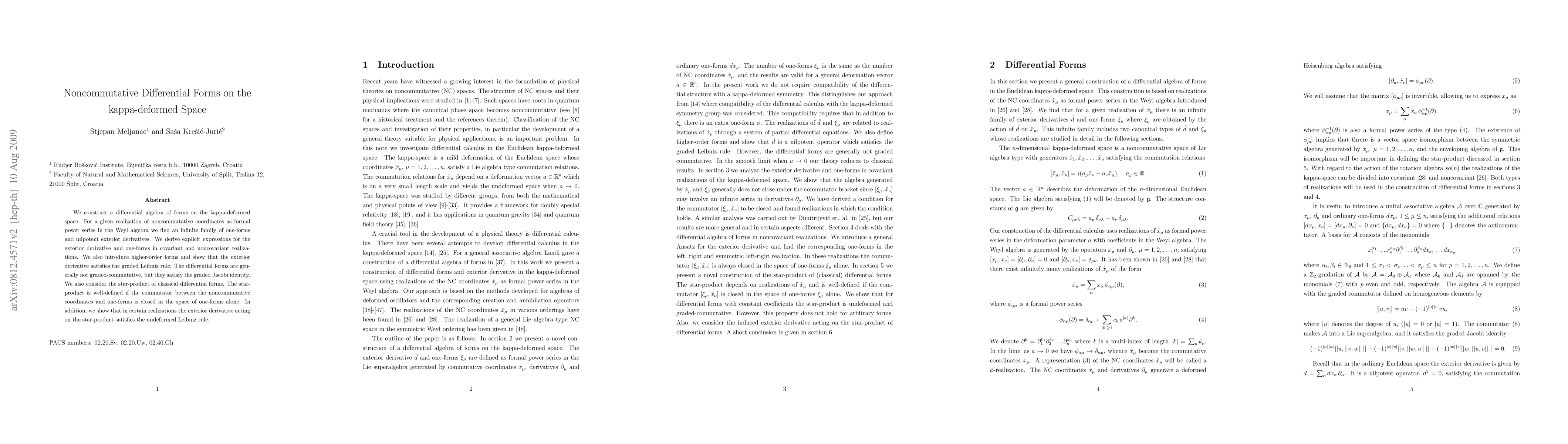 This paper constructs a differential algebra of forms on kappa-deformed space, introducing noncommutative coordinates and deriving explicit expressions for one-forms and exterior derivatives. It explores higher-order forms and the graded Jacobi identity, while also discussing the star-product of classical differential forms under specific conditions.