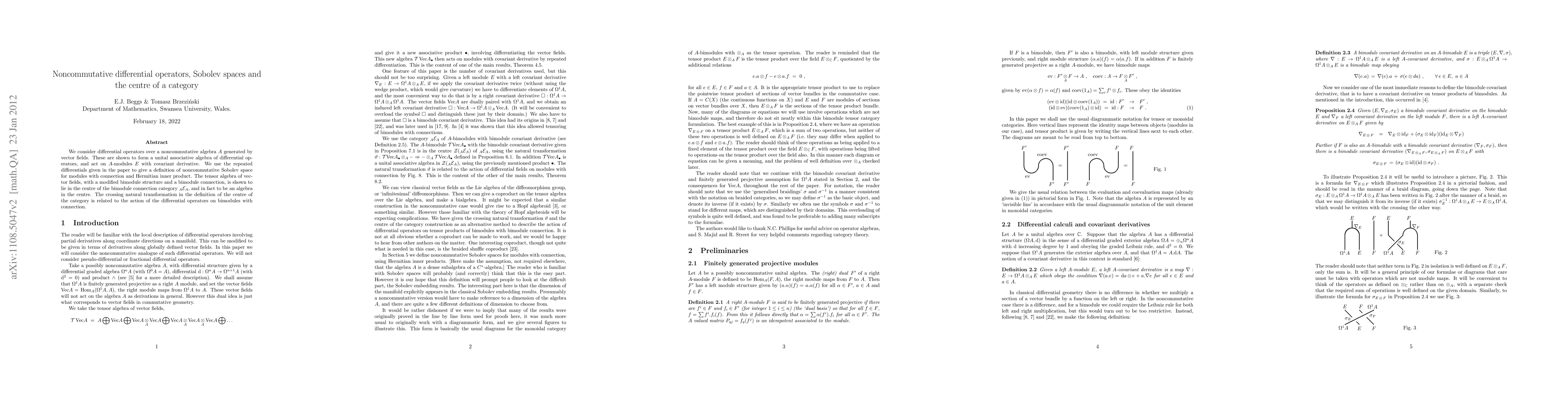 This paper explores differential operators over a noncommutative algebra, establishing a unital associative algebra acting on modules with covariant derivatives. It introduces noncommutative Sobolev spaces for modules with connection and Hermitian inner product, and demonstrates that the tensor algebra of vector fields lies in the centre of the bimodule connection category.