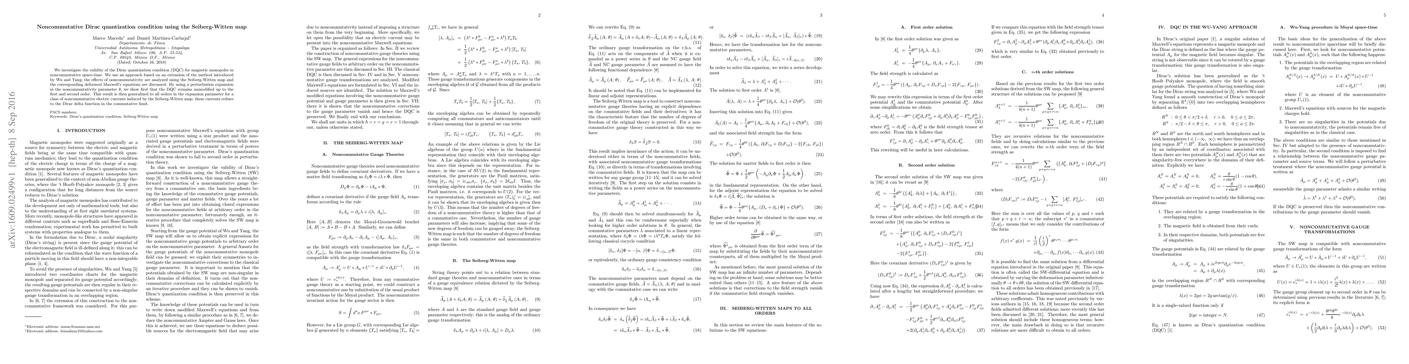 This paper explores the Dirac quantization condition (DQC) for magnetic monopoles in noncommutative space-time, demonstrating its persistence through the Seiberg-Witten map up to the second order. It shows that the DQC remains valid at all orders in a perturbation expansion based on noncommutativity, with currents induced by the Seiberg-Witten map approaching Dirac delta functions in the commutative limit.