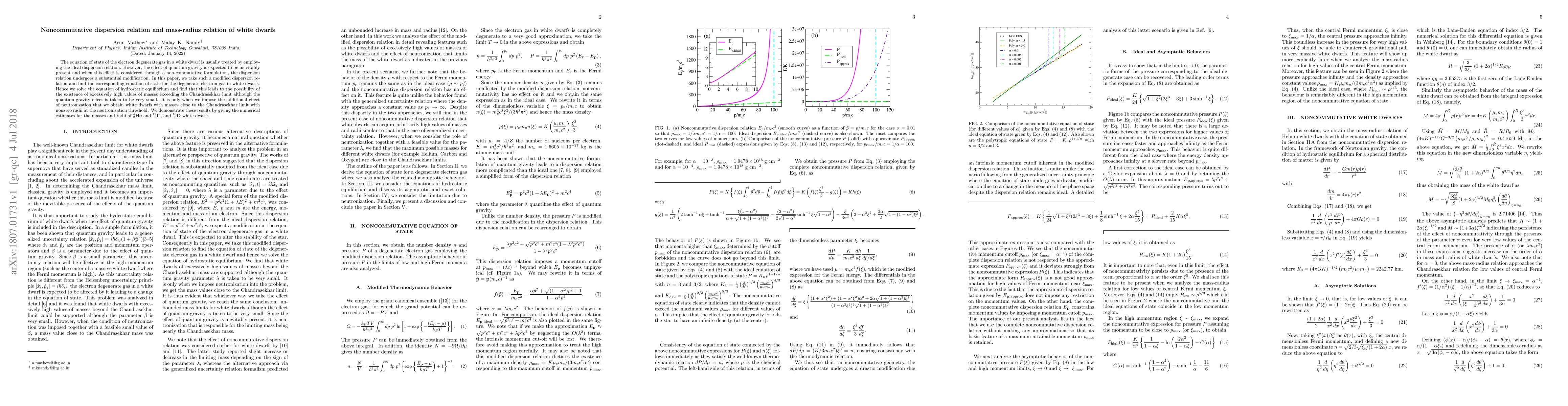 This paper explores the impact of noncommutative dispersion relations on the equation of state for electron degenerate gases in white dwarfs, revealing that quantum gravity effects can lead to masses exceeding the Chandrasekhar limit, but neutronization brings masses closer to this limit with nonzero radii. Numerical estimates for $^4He$, $^{12}C$, and $^{16}O$ white dwarfs are provided.