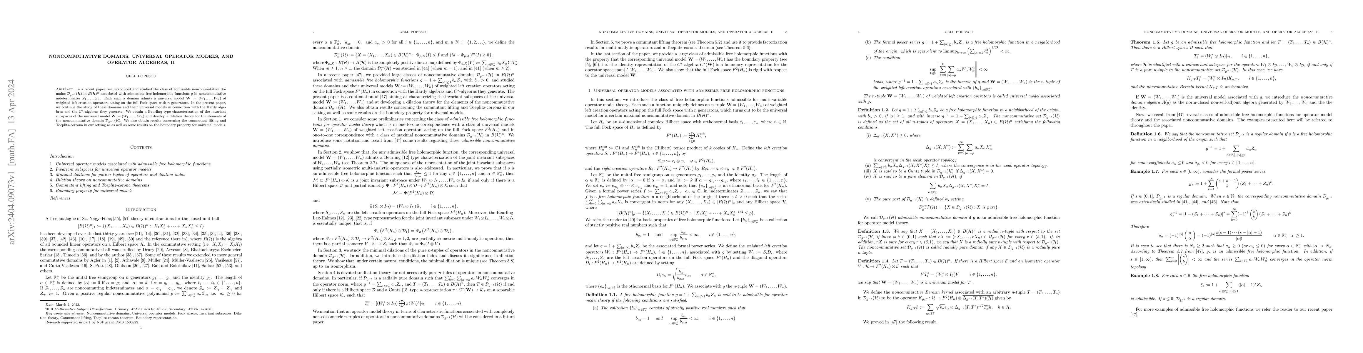 In a recent paper, we introduced and studied the class of admissible noncommutative domains $D_{g^{-1}}(H)$ in $B(H)^n$ associated with admissible free holomorphic functions $g$ in noncommutative indeterminates $Z_1,\ldots, Z_n$. Each such a domain admits a universal model ${\bf W}:=(W_1,\ldots, W_n)$ of weighted left creation operators acting on the full Fock space with $n$ generators. In the present paper, we continue the study of these domains and their universal models in connection with the Hardy algebras and the $C^*$-algebras they generate. We obtain a Beurling type characterization of the invariant subspaces of the universal model ${\bf W}:=(W_1,\ldots, W_n)$ and develop a dilation theory for the elements of the noncommutative domain $D_{g^{-1}}(H)$. We also obtain results concerning the commutant lifting and Toeplitz-corrona in our setting as as well as some results on the boundary property for universal models.