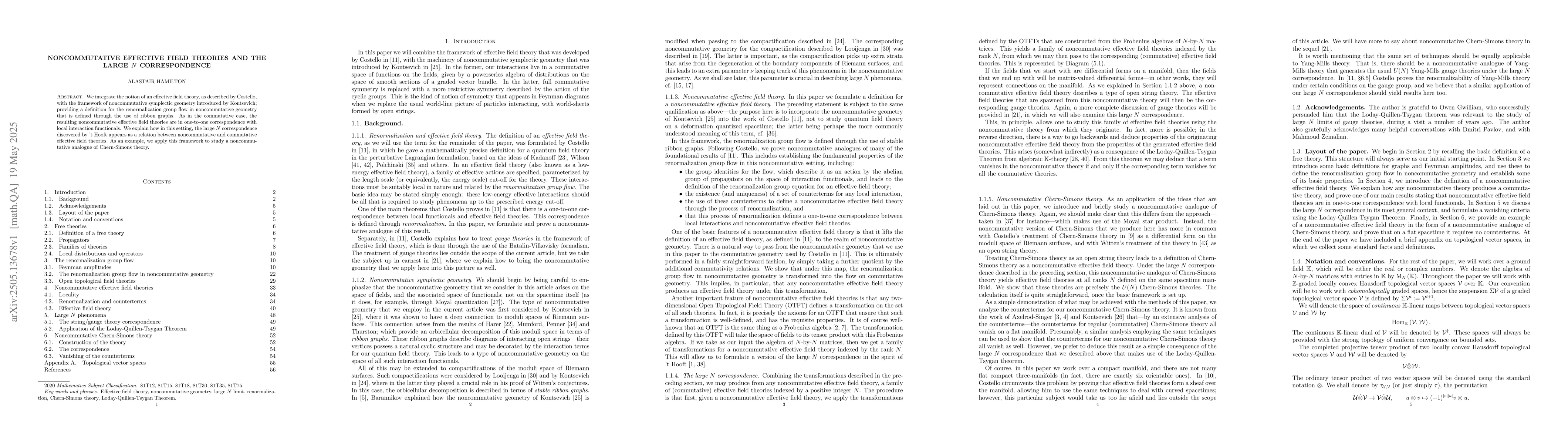 The paper integrates effective field theory concepts by Costello with noncommutative symplectic geometry from Kontsevich, defining renormalization group flow in noncommutative geometry via ribbon graphs. It demonstrates a one-to-one correspondence between noncommutative effective field theories and local interaction functionals, and illustrates the large N correspondence as a relation between noncommutative and commutative effective field theories, exemplified through a noncommutative Chern-Simons theory analysis.