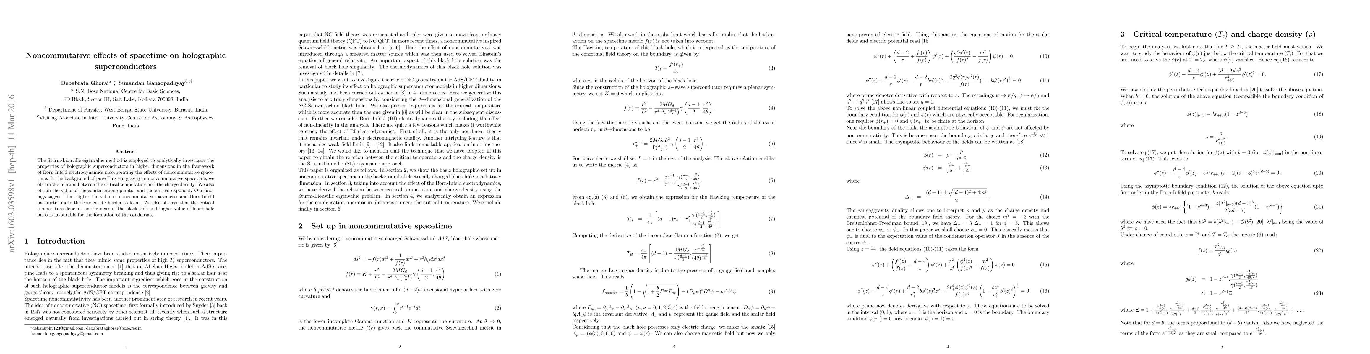 The paper presents a detailed analytical approach using Sturm-Liouville eigenvalue method to study holographic superconductors in noncommutative spacetime, extending previous work to include Born-Infeld electrodynamics.