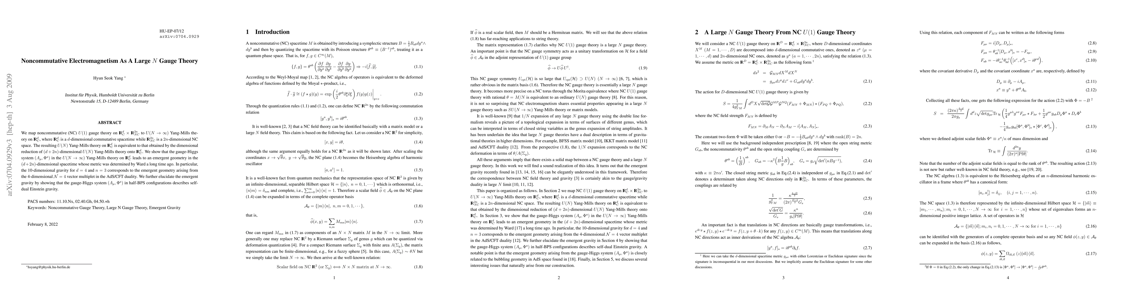 This paper demonstrates the equivalence between noncommutative U(1) gauge theory and large N Yang-Mills theory, revealing an emergent geometry from the gauge-Higgs system. Specifically, it shows that 10-dimensional gravity arises from the 4-dimensional N=4 vector multiplet in the context of AdS/CFT duality.