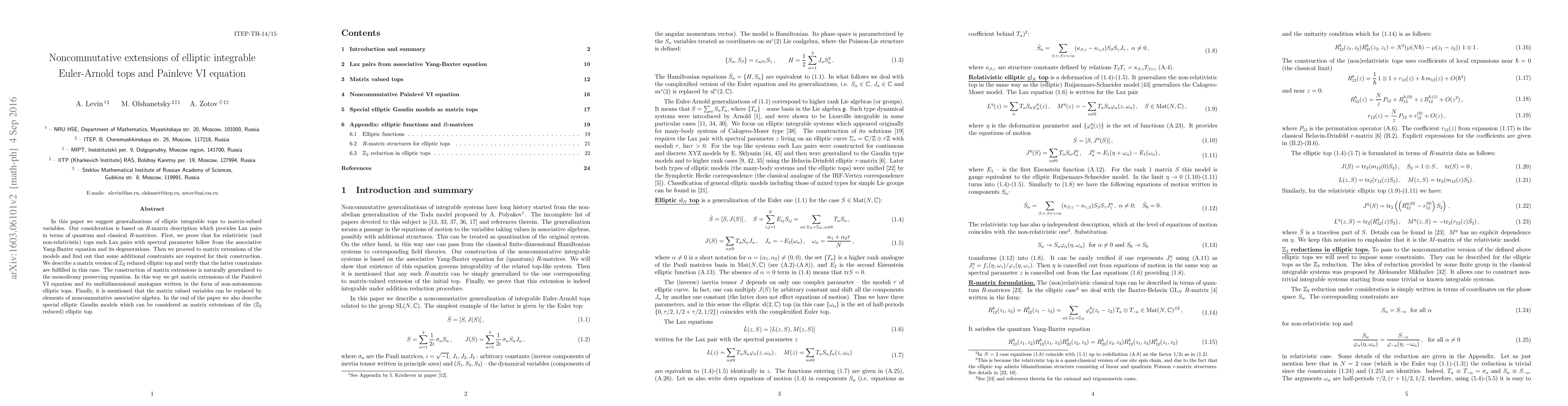 This paper proposes noncommutative extensions of elliptic integrable tops, utilizing $R$-matrix descriptions to derive Lax pairs from the associative Yang-Baxter equation. It generalizes these models to matrix variables, leading to extensions of the Painlevé VI equation and its multidimensional analogues, and mentions the applicability to noncommutative associative algebras.