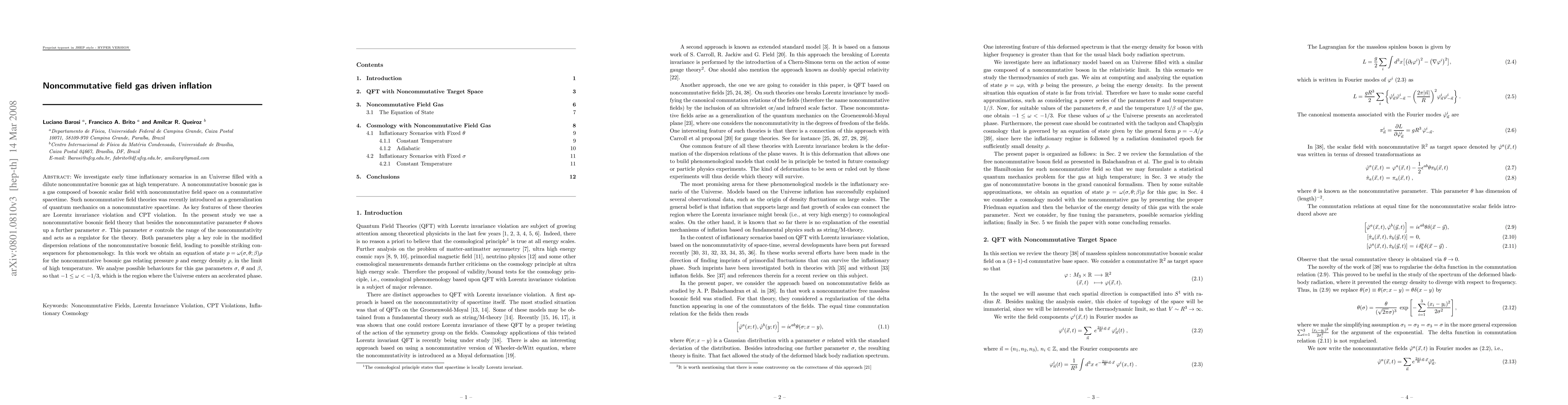We investigate early time inflationary scenarios in an Universe filled with a dilute noncommutative bosonic gas at high temperature. A noncommutative bosonic gas is a gas composed of bosonic scalar field with noncommutative field space on a commutative spacetime. Such noncommutative field theories was recently introduced as a generalization of quantum mechanics on a noncommutative spacetime. As key features of these theories are Lorentz invariance violation and CPT violation. In the present study we use a noncommutative bosonic field theory that besides the noncommutative parameter $\theta$ shows up a further parameter $\sigma$. This parameter $\sigma$ controls the range of the noncommutativity and acts as a regulator for the theory. Both parameters play a key role in the modified dispersion relations of the noncommutative bosonic field, leading to possible striking consequences for phenomenology. In this work we obtain an equation of state $p=\omega(\sigma,\theta;\beta)\rho$ for the noncommutative bosonic gas relating pressure $p$ and energy density $\rho$, in the limit of high temperature. We analyse possible behaviours for this gas parameters $\sigma$, $\theta$ and $\beta$, so that $-1\leq\omega<-1/3$, which is the region where the Universe enters an accelerated phase.