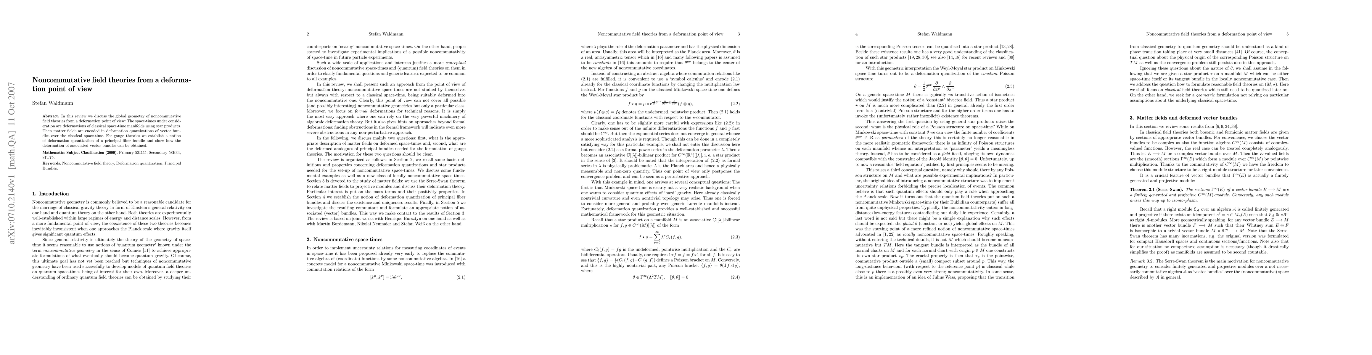 This paper explores noncommutative field theories through the lens of deformation quantization, examining how space-times are deformed from classical manifolds via star products and how matter fields and gauge theories are encoded in this framework. It also introduces a method for quantizing principal fiber bundles and associated vector bundles in this noncommutative setting.
