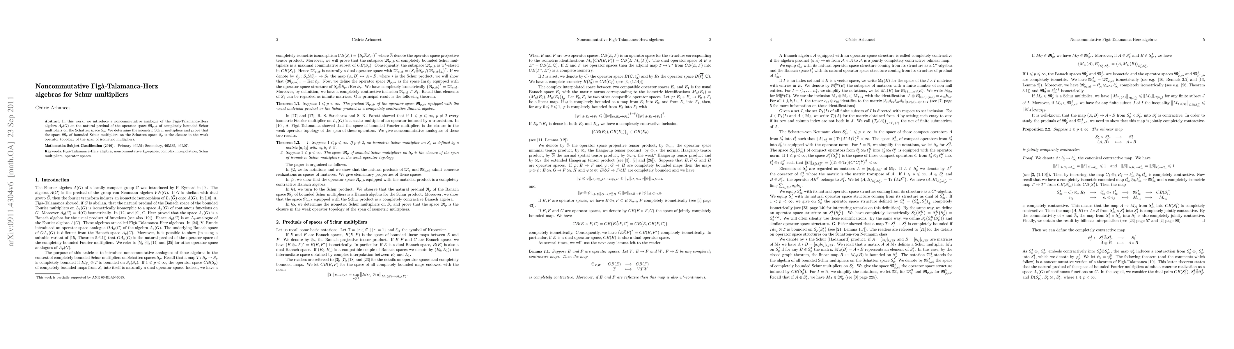 We introduce a noncommutative analogue of the Fig\'a-Talamanca-Herz algebra $A_p(G)$ on the natural predual of the operator space $\frak{M}_{p,cb}$ of completely bounded Schur multipliers on Schatten space $S_p$. We determine the isometric Schur multipliers and prove that the space $\frak{M}_{p}$ of bounded Schur multipliers on Schatten space $S_p$ is the closure in the weak operator topology of the span of isometric multipliers.