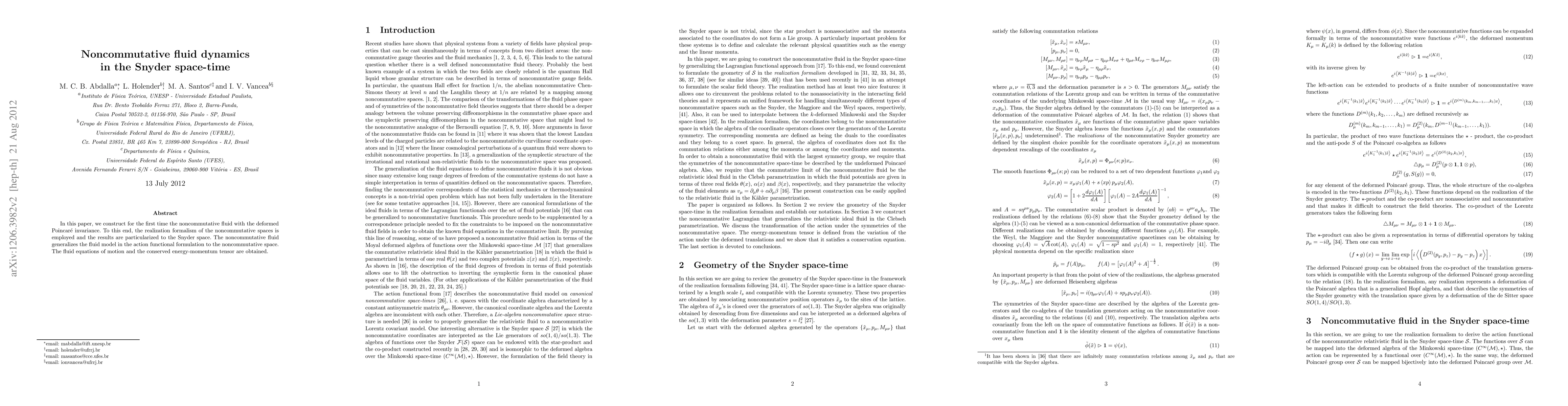 This paper constructs a noncommutative fluid model with deformed Poincaré invariance, utilizing the realization formalism for noncommutative spaces, and applies it to Snyder space-time. The study derives the fluid equations of motion and a conserved energy-momentum tensor.