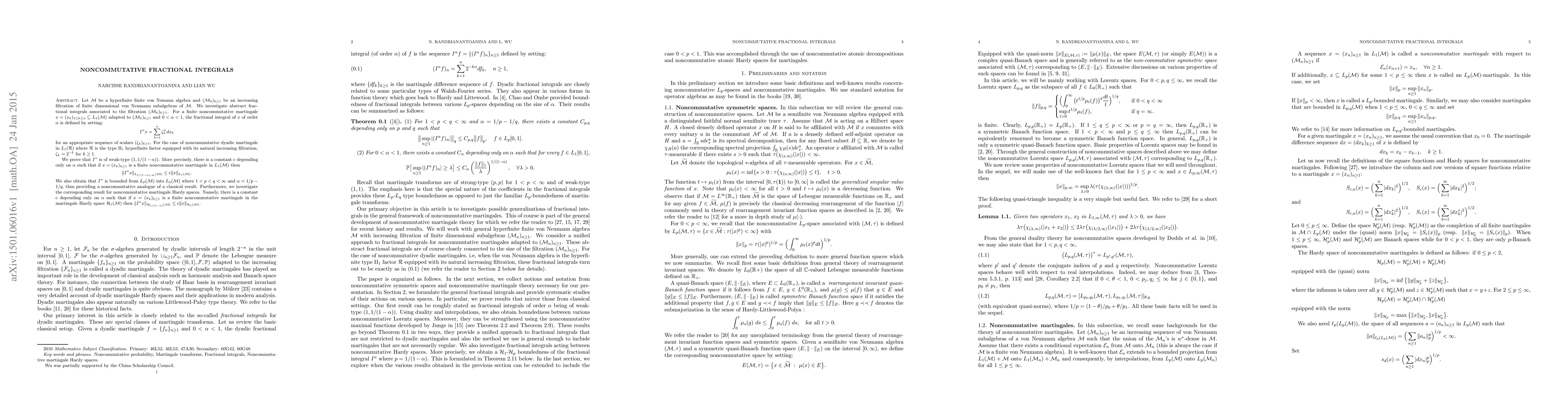 Let $\M$ be a hyperfinite finite von Nemann algebra and $(\M_k)_{k\geq 1}$ be an increasing filtration of finite dimensional von Neumann subalgebras of $\M$. We investigate abstract fractional integrals associated to the filtration $(\M_k)_{k\geq 1}$. For a finite noncommutative martingale $x=(x_k)_{1\leq k\leq n} \subseteq L_1(\M)$ adapted to $(\M_k)_{k\geq 1}$ and $0<\alpha<1$, the fractional integral of $x$ of order $\alpha$ is defined by setting: $$I^\alpha x = \sum_{k=1}^n \zeta_k^{\alpha} dx_k$$ for an appropriate sequence of scalars $(\zeta_k)_{k\geq 1}$. For the case of noncommutative dyadic martingale in $L_1(\R)$ where $\R$ is the type ${\rm II}_1$ hyperfinite factor equipped with its natural increasing filtration, $\zeta_k=2^{-k}$ for $k\geq 1$. We prove that $I^\alpha$ is of weak-type $(1, 1/(1-\alpha))$. More precisely, there is a constant ${\mathrm c}$ depending only on $\alpha$ such that if $x=(x_k)_{k\geq 1}$ is a finite noncommutative martingale in $L_1(\M)$ then \[\|I^\alpha x\|_{L_{1/(1-\alpha),\infty}(\mathcal{\M})}\leq {\mathrm c}\|x\|_{L_1(\M)}.\] We also obtain that $I^\alpha$ is bounded from $L_{p}(\M)$ into $L_{q}(\M)$ where $1