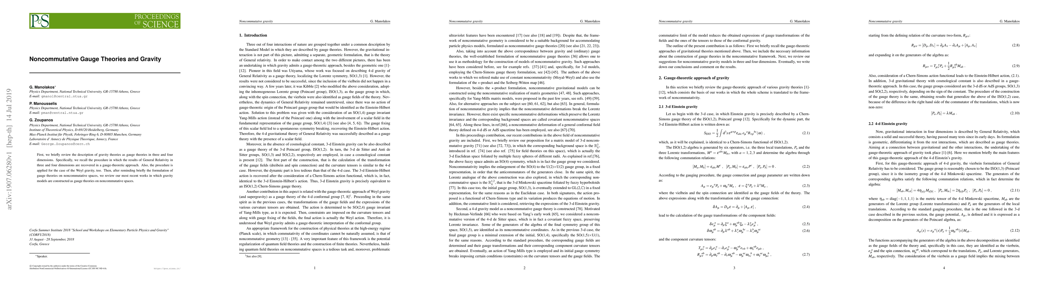 This paper reviews the gauge-theoretic approach to gravity in three and four dimensions, including General Relativity and Weyl gravity, and extends this framework to construct gravity models as gauge theories on noncommutative spaces. Recent advancements in noncommutative gauge theories applied to gravity are highlighted.