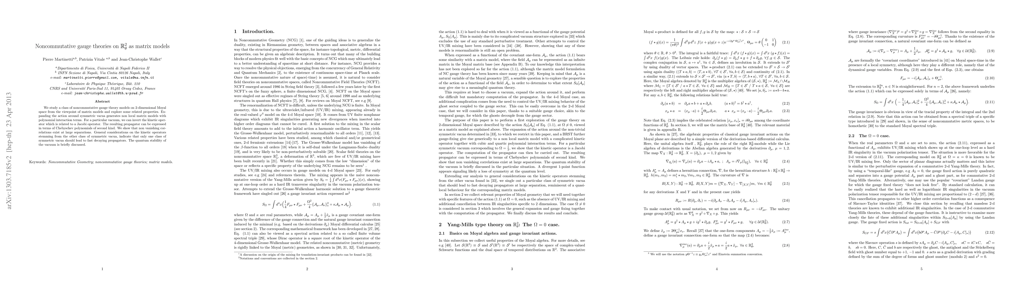 We study a class of noncommutative gauge theory models on 2-dimensional Moyal space from the viewpoint of matrix models and explore some related properties. Expanding the action around symmetric vacua generates non local matrix models with polynomial interaction terms. For a particular vacuum, we can invert the kinetic operator which is related to a Jacobi operator. The resulting propagator can be expressed in terms of Chebyschev polynomials of second kind. We show that non vanishing correlations exist at large separations. General considerations on the kinetic operators stemming from the other class of symmetric vacua, indicates that only one class of symmetric vacua should lead to fast decaying propagators. The quantum stability of the vacuum is briefly discussed.