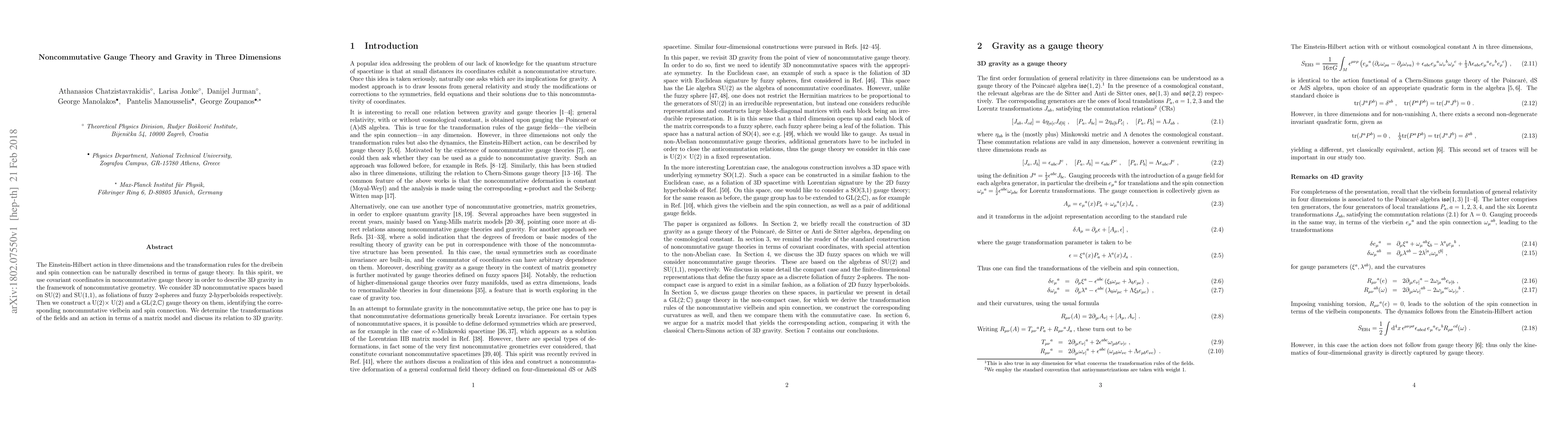 The Einstein-Hilbert action in three dimensions and the transformation rules for the dreibein and spin connection can be naturally described in terms of gauge theory. In this spirit, we use covariant coordinates in noncommutative gauge theory in order to describe 3D gravity in the framework of noncommutative geometry. We consider 3D noncommutative spaces based on SU(2) and SU(1,1), as foliations of fuzzy 2-spheres and fuzzy 2-hyperboloids respectively. Then we construct a U(2)$\times$ U(2) and a GL(2,$\mathbb{C}$) gauge theory on them, identifying the corresponding noncommutative vielbein and spin connection. We determine the transformations of the fields and an action in terms of a matrix model and discuss its relation to 3D gravity.