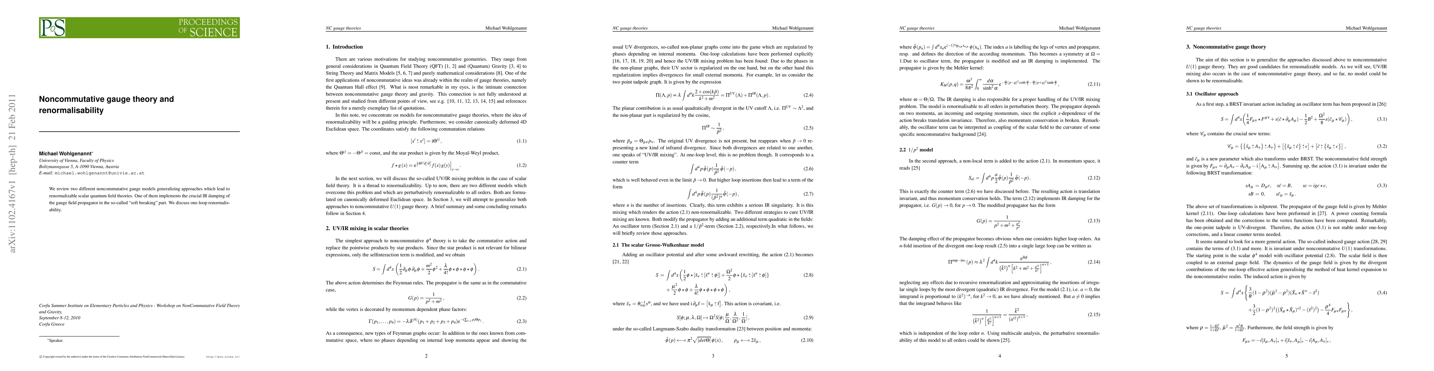 This paper reviews two noncommutative gauge models that extend renormalizable scalar quantum field theories, focusing on one model that incorporates IR damping in the gauge field propagator via "soft breaking." The study examines one-loop renormalizability in these models.