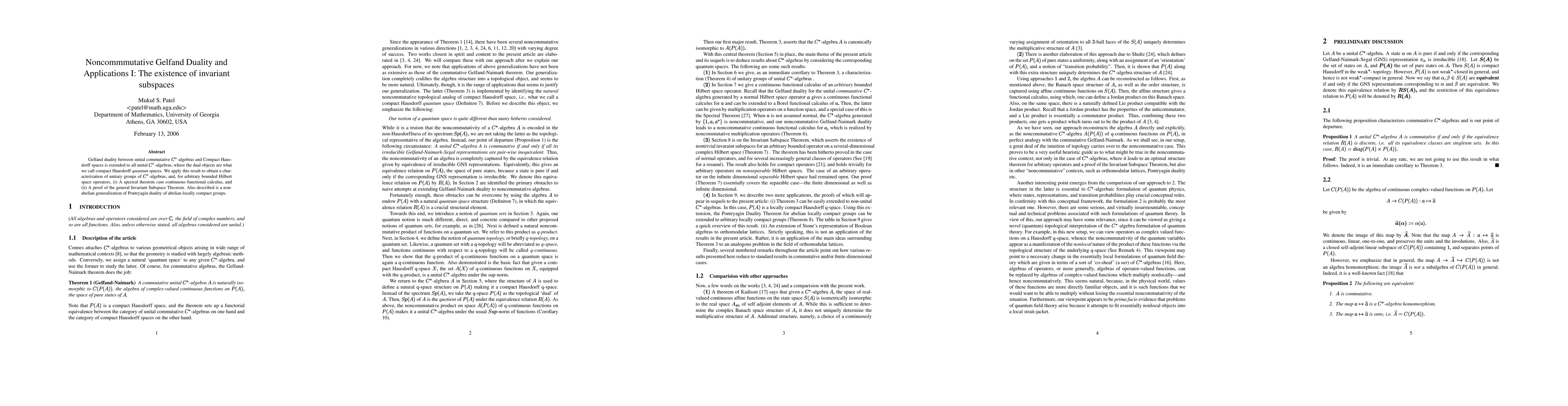 This paper extends Gelfand duality to noncommutative C*-algebras, introducing compact Hausdorff quantum spaces as dual objects. It applies this extension to characterize unitary groups, prove a spectral theorem with continuous functional calculus, and establish a general Invariant Subspace Theorem for bounded Hilbert space operators.