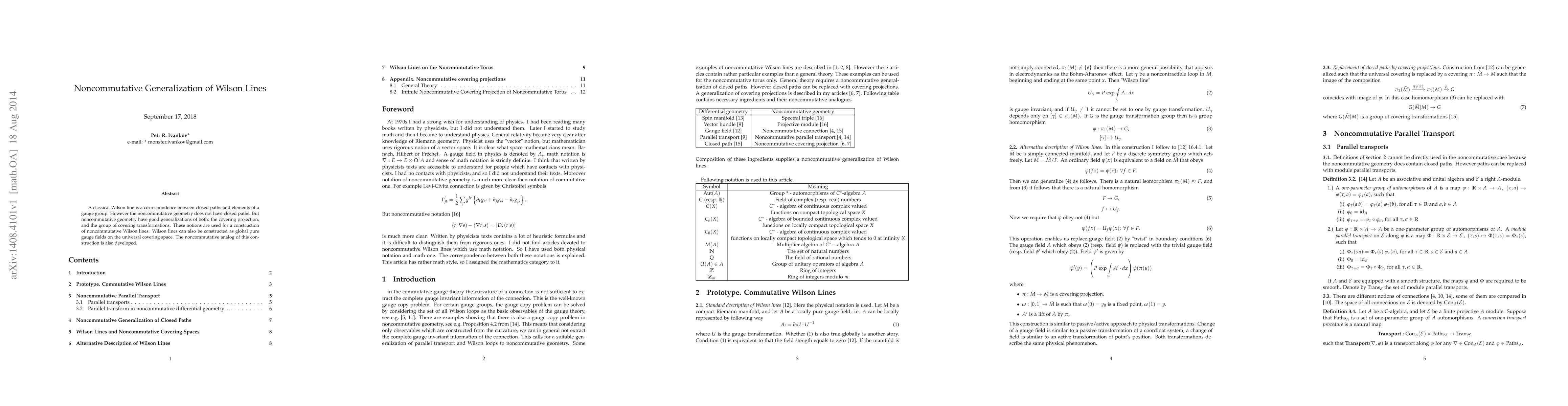 This paper constructs a noncommutative generalization of classical Wilson lines using covering projections and transformations in noncommutative geometry, and develops a noncommutative analog of global pure gauge fields on the universal covering space.