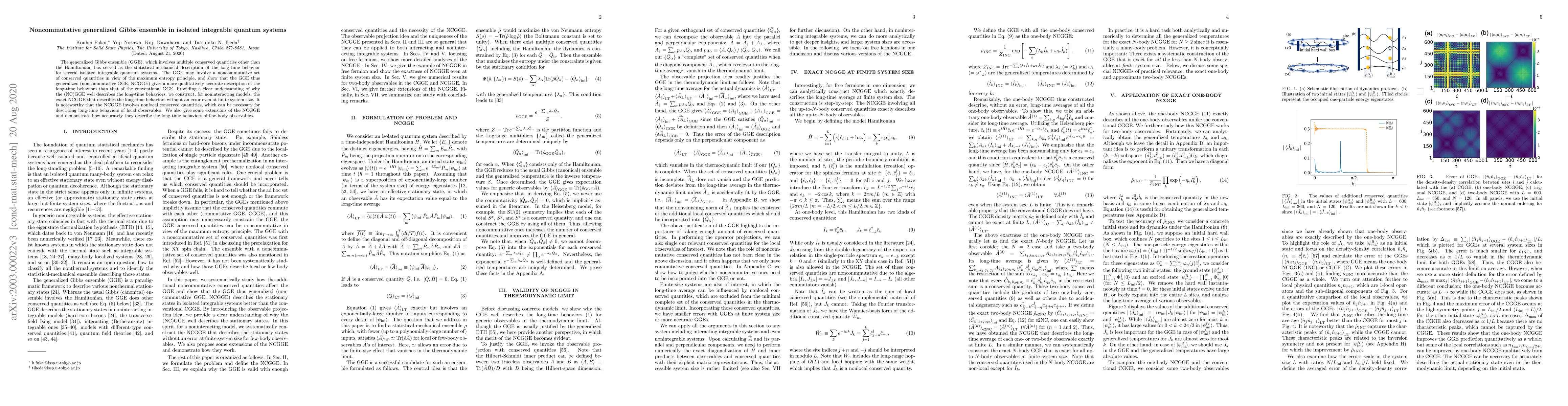 The generalized Gibbs ensemble (GGE), which involves multiple conserved quantities other than the Hamiltonian, has served as the statistical-mechanical description of the long-time behavior for several isolated integrable quantum systems. The GGE may involve a noncommutative set of conserved quantities in view of the maximum entropy principle, and show that the GGE thus generalized (noncommutative GGE, NCGGE) gives a more qualitatively accurate description of the long-time behaviors than that of the conventional GGE. Providing a clear understanding of why the (NC)GGE well describes the long-time behaviors, we construct, for noninteracting models, the exact NCGGE that describes the long-time behaviors without an error even at finite system size. It is noteworthy that the NCGGE involves nonlocal conserved quantities, which can be necessary for describing long-time behaviors of local observables. We also give some extensions of the NCGGE and demonstrate how accurately they describe the long-time behaviors of few-body observables.