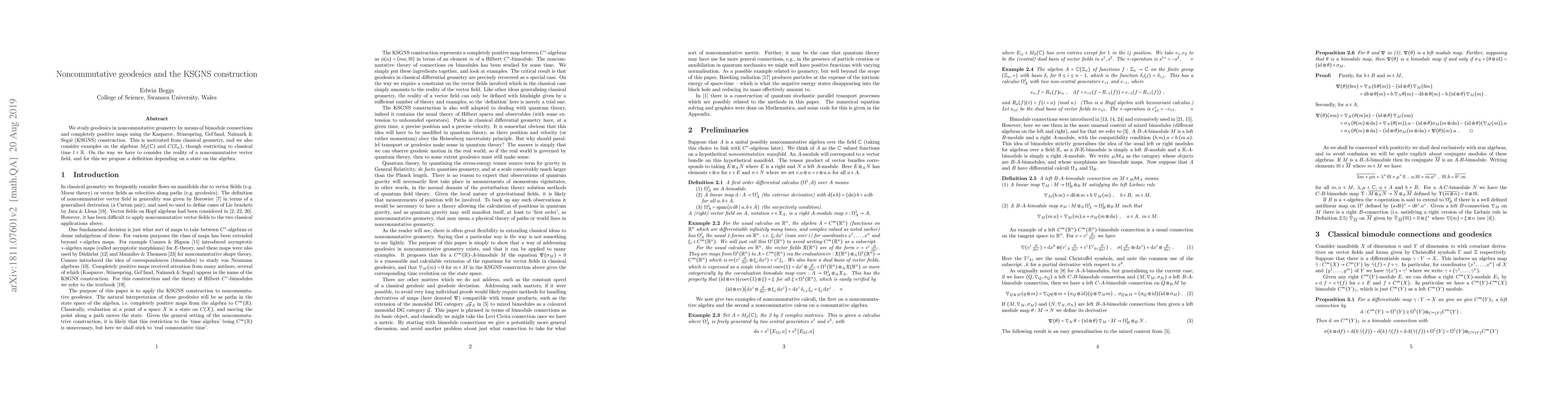We study geodesics in noncommutative geometry by means of bimodule connections and completely positive maps using the Kasparov, Stinespring, Gel'fand, Naimark & Segal (KSGNS) construction. This is motivated from classical geometry, and we also consider examples on the algebras M_2(C) and C(Z_n), though restricting to classical real time. On the way we have to consider the reality of a noncommutative vector field, and for this we propose a definition depending on a state on the algebra.