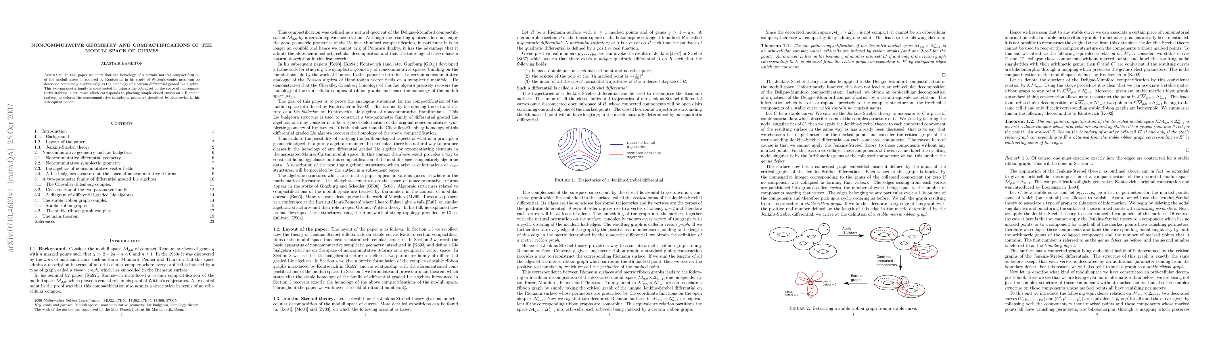 In this paper we show that the homology of a certain natural compactification of the moduli space, introduced by Kontsevich in his study of Witten's conjectures, can be described completely algebraically as the homology of a certain differential graded Lie algebra. This two-parameter family is constructed by using a Lie cobracket on the space of noncommutative 0-forms, a structure which corresponds to pinching simple closed curves on a Riemann surface, to deform the noncommutative symplectic geometry described by Kontsevich in his subsequent papers.