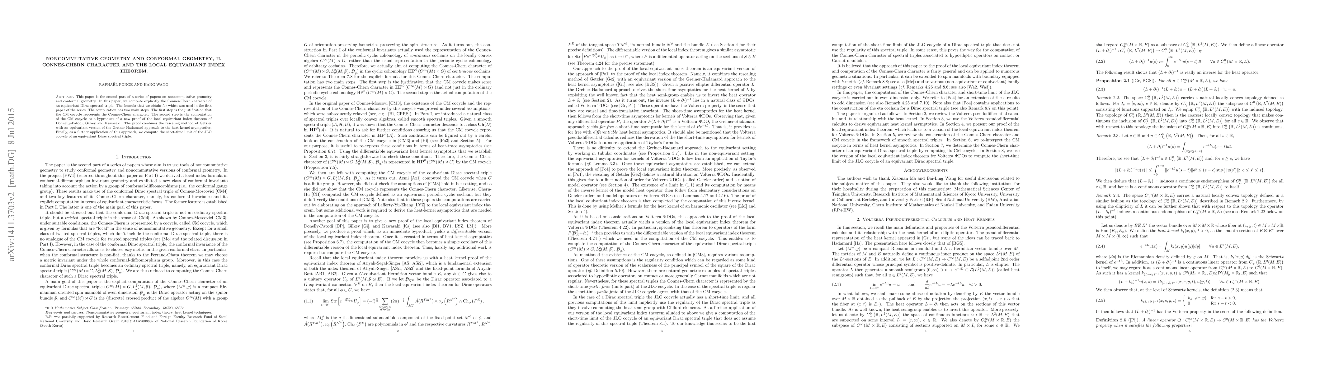 This paper is the second part of a series of papers on noncommutative geometry and conformal geometry. In this paper, we compute explicitly the Connes-Chern character of an equivariant Dirac spectral triple. The formula that we obtain for which was used in the first paper of the series. The computation has two main steps. The first step is the justification that the CM cocycle represents the Connes-Chern character. The second step is the computation of the CM cocycle as a byproduct of a new proof of the local equivariant index theorem of Donnelly-Patodi, Gilkey and Kawasaki. The proof combines the rescaling method of Getzler with an equivariant version of the Greiner-Hadamard approach to the heat kernel asymptotics. Finally, as a further application of this approach, we computate the short-time limit of the JLO cocycle of an equivariant Dirac spectral triple.