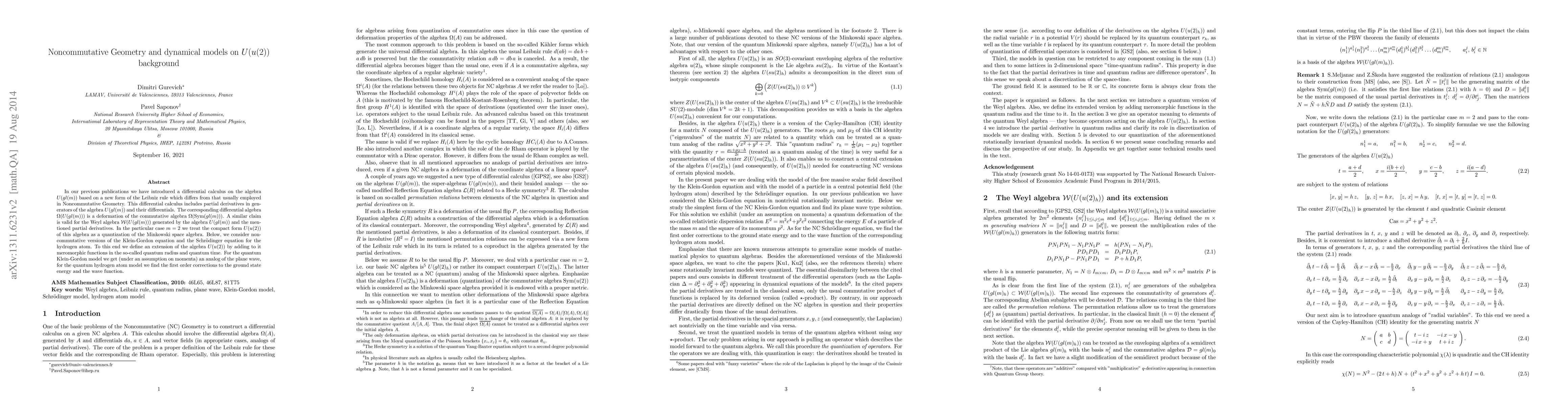 In our previous publications we have introduced a differential calculus on the algebra $U(gl(m))$ based on a new form of the Leibniz rule which differs from that usually employed in Noncommutative Geometry. This differential calculus includes partial derivatives in generators of the algebra $U(gl(m))$ and their differentials. The orresponding differential algebra $\Omega(U(gl(m)))$ is a deformation of the commutative algebra $\Omega({\rm Sym}(gl(m)))$.A similar claim is valid for the Weyl algebra ${\cal W}(U(gl(m)))$ generated by the algebra $U(gl(m))$ and the mentioned partial derivatives. In the particular case $m=2$ we treat the compact form $U(u(2))$ of this algebra as a quantization of the Minkowski space algebra. Below we consider noncommutative versions of the Klein-Gordon equation and the Schr\"odinger equation for the hydrogen atom. We show that these quantum models become in a sense discrete.For the quantum Klein-Gordon model we get (under an assumption on momenta) an analog of the plane wave, for the quantum hydrogen atom model we find the first order corrections to the ground state energy and wave function.