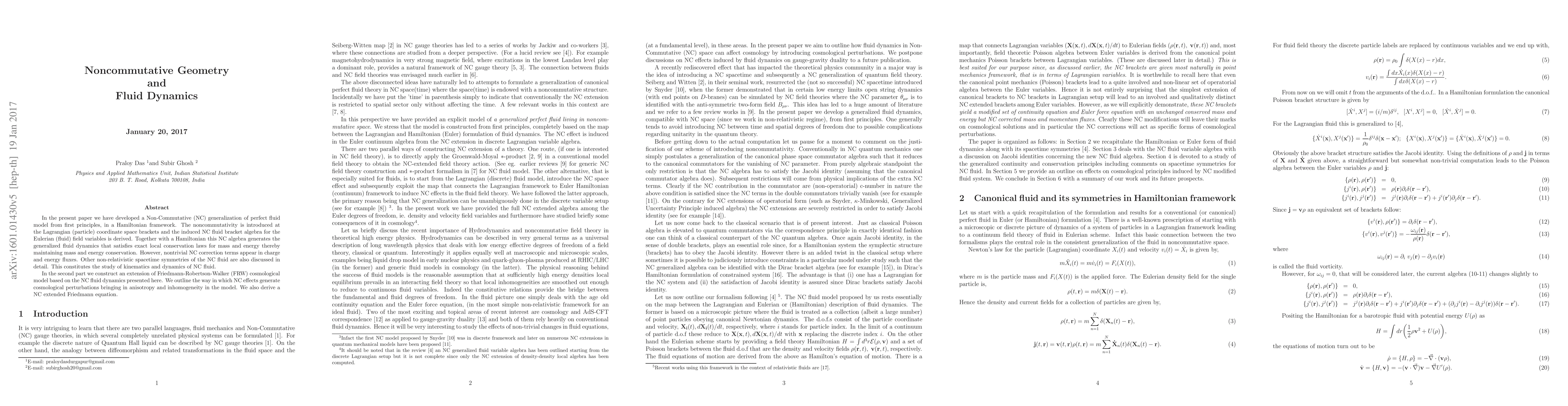 This paper develops a noncommutative generalization of the perfect fluid model within a Hamiltonian framework, introducing noncommutativity at the Lagrangian level and deriving an associated NC fluid bracket algebra. It extends the Friedmann-Robertson-Walker cosmological model using the NC fluid dynamics, generating cosmological perturbations that introduce anisotropy and inhomogeneity.