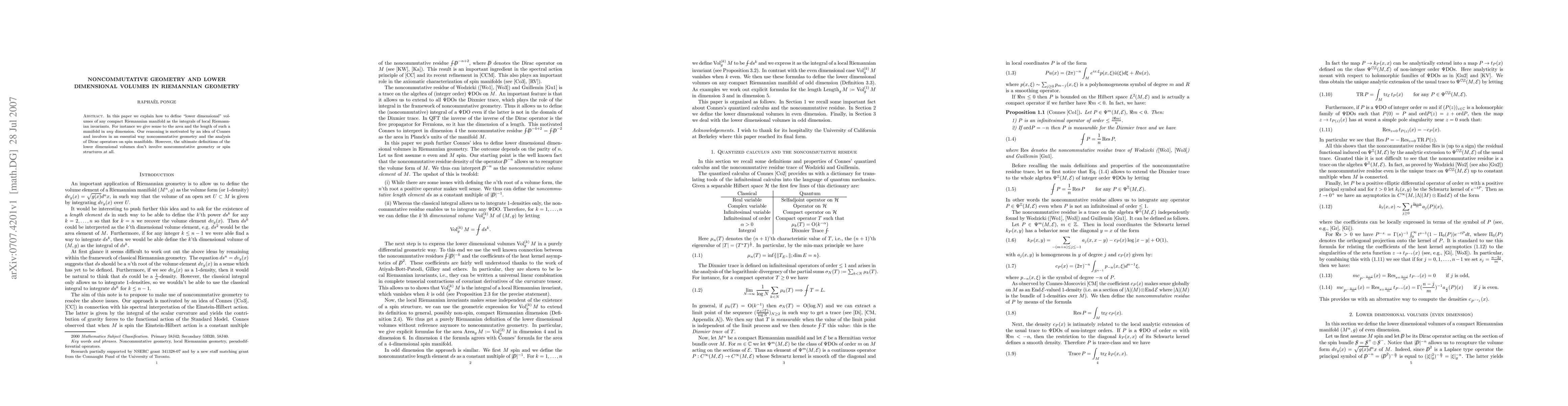 This paper introduces a method to define "lower dimensional" volumes on compact Riemannian manifolds through integrals of local Riemannian invariants, inspired by Connes' ideas, using noncommutative geometry and Dirac operator analysis, though the final definitions remain purely Riemannian.