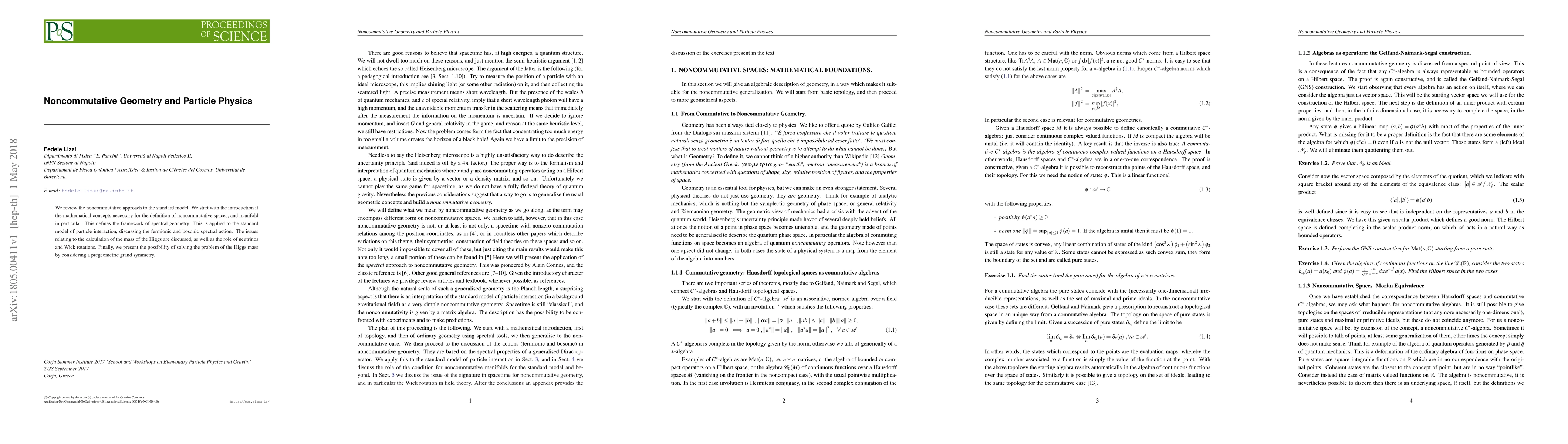 We review the noncommutative approach to the standard model. We start with the introduction if the mathematical concepts necessary for the definition of noncommutative spaces, and manifold in particular. This defines the framework of spectral geometry. This is applied to the standard model of particle interaction, discussing the fermionic and bosonic spectral action. The issues relating to the calculation of the mass of the Higgs are discussed, as well as the role of neutrinos and Wick rotations. Finally, we present the possibility of solving the problem of the Higgs mass by considering a pregeometric grand symmetry.